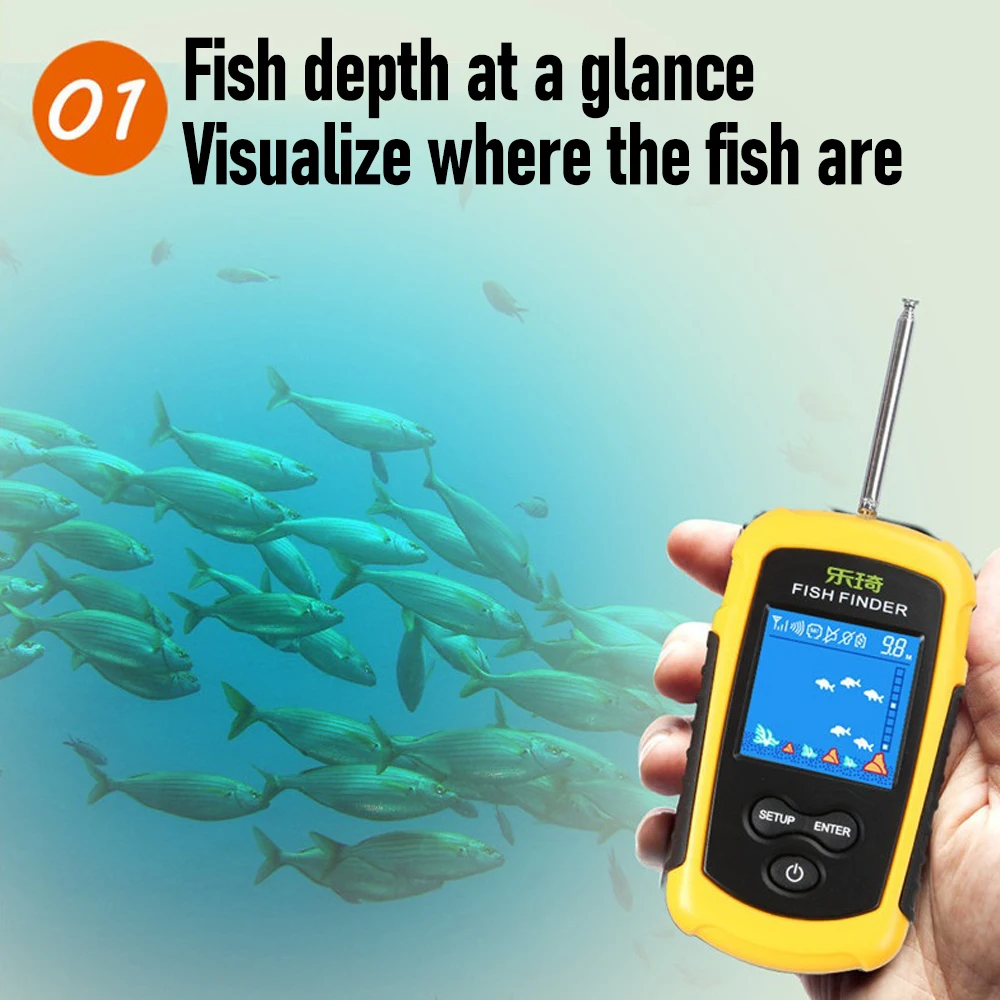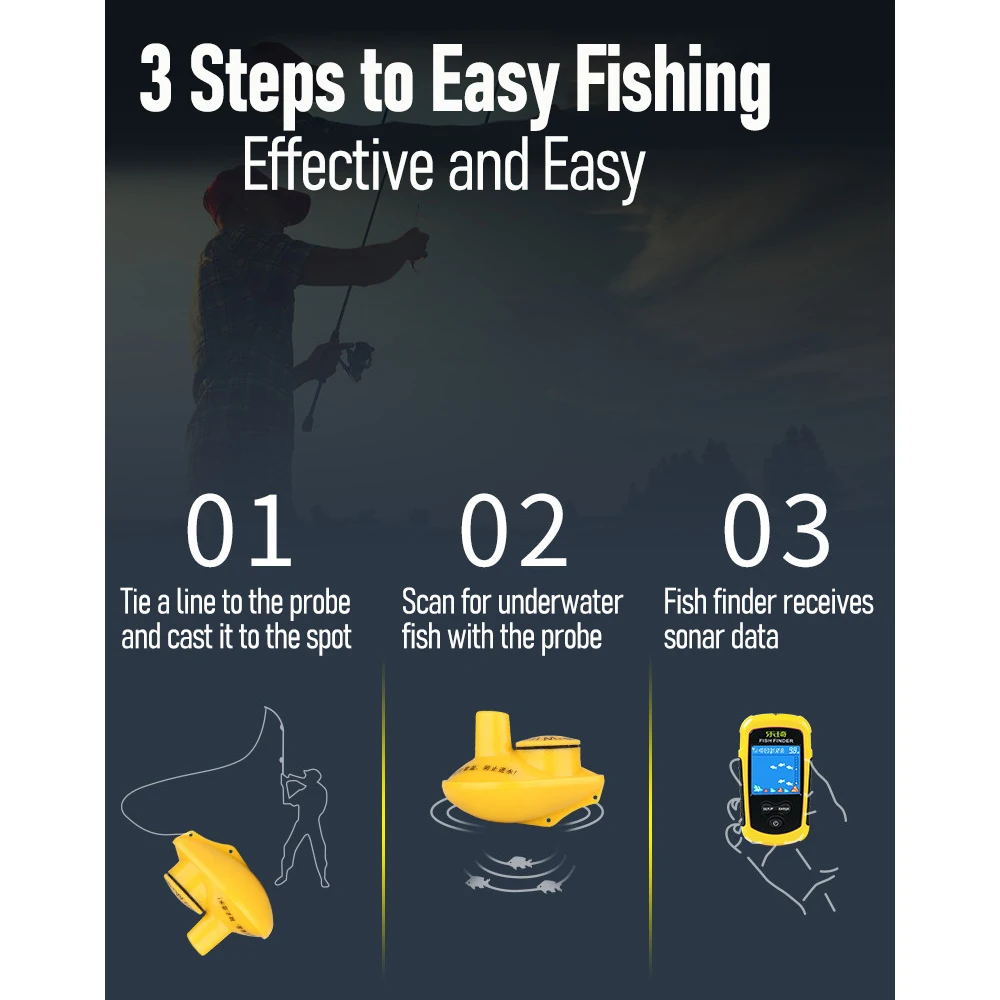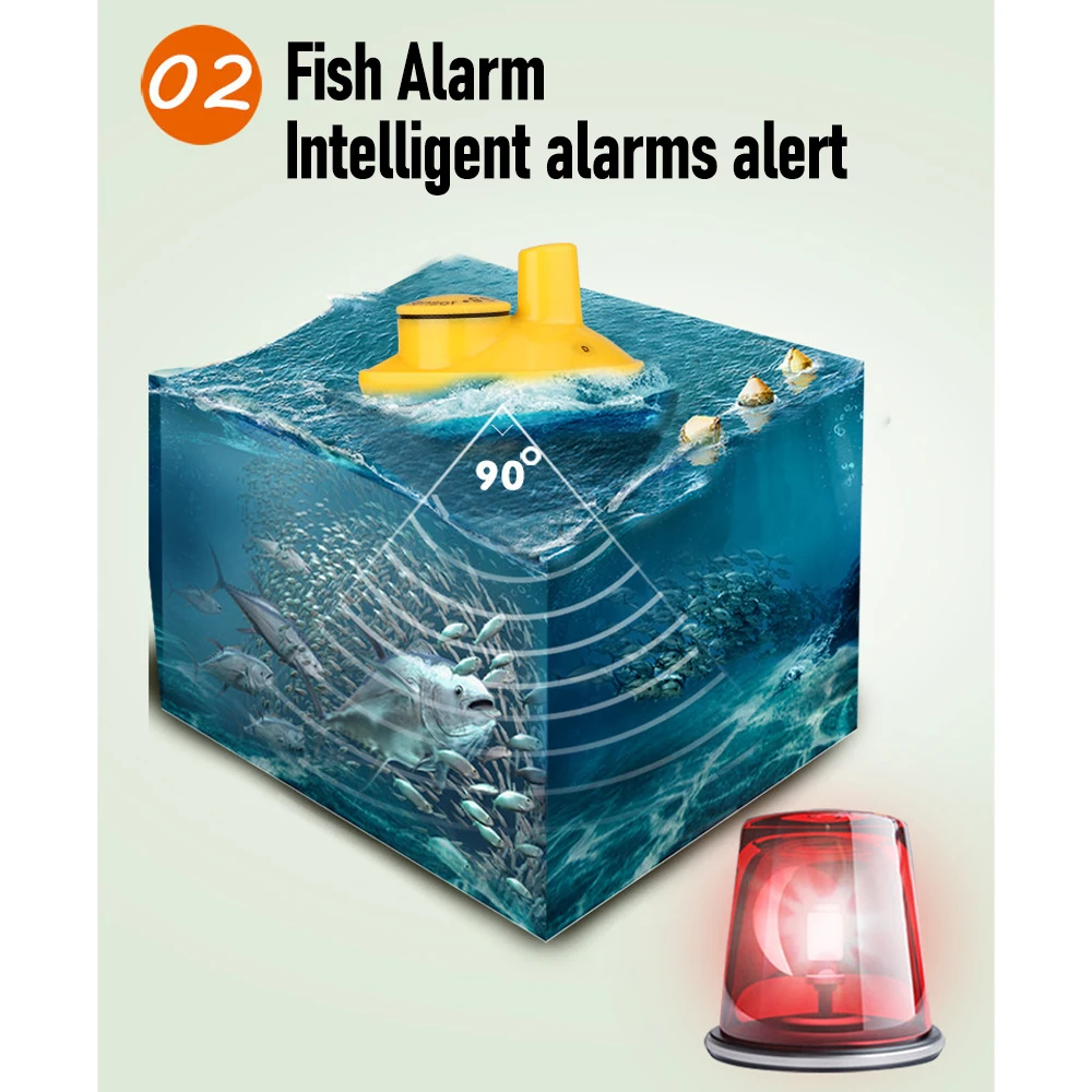 3. Una vez que el transductor buscador de peces se tire al agua y se encienda la unidad de visualización, recibirá alarmas cuando los peces o las escuelas de pesca pasen. Profundidad de detección: 40m; Distancia de recepción: 100m.