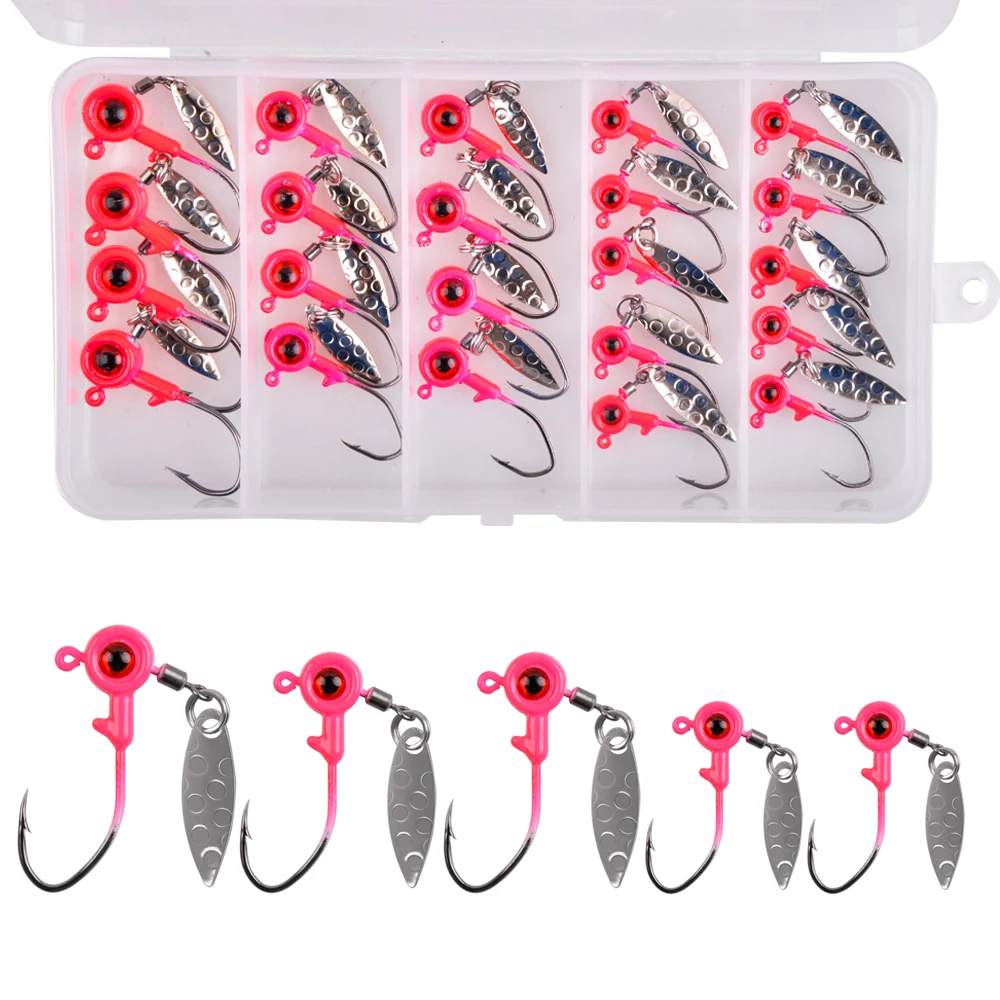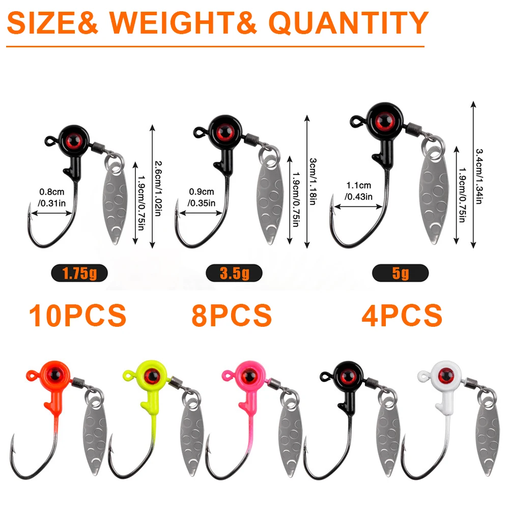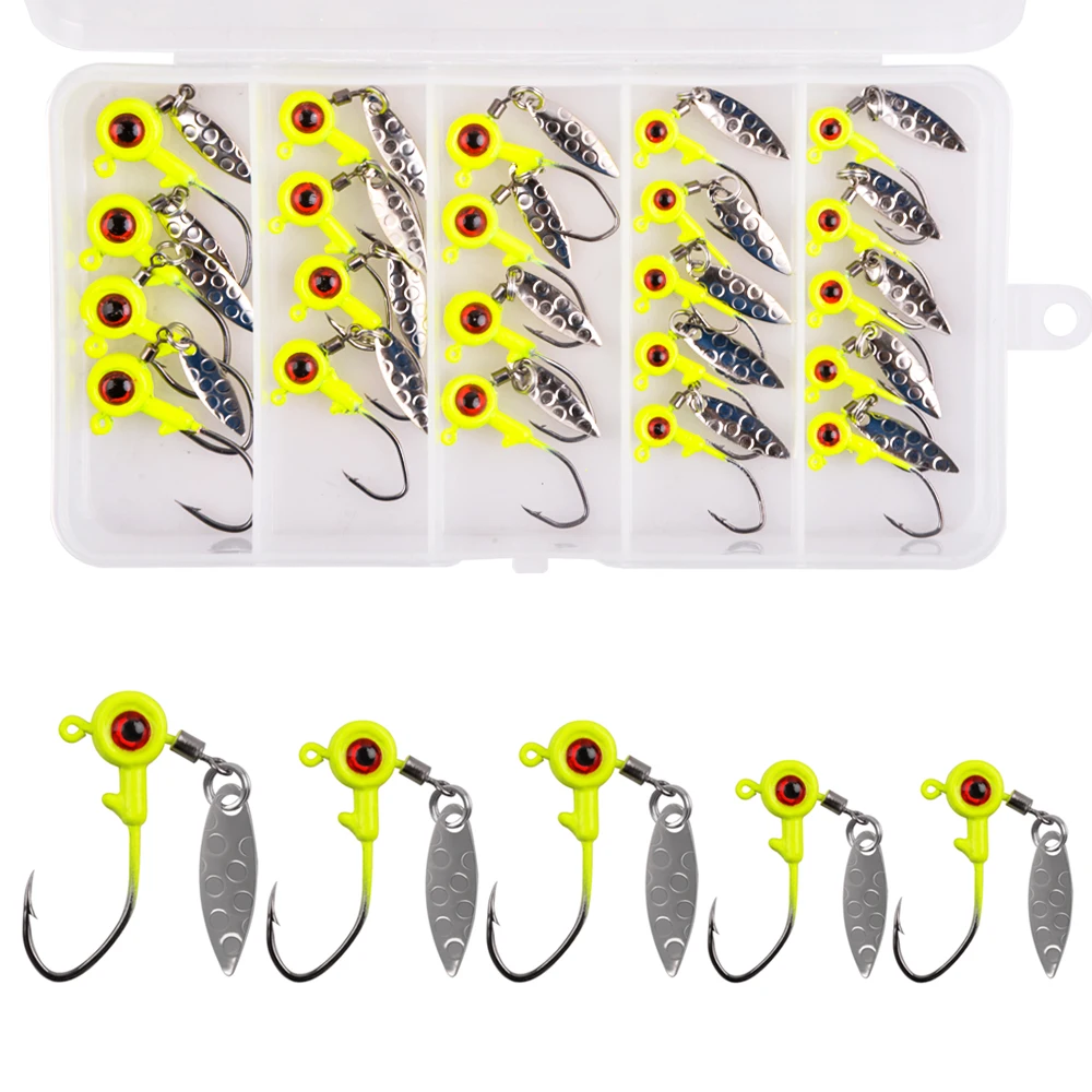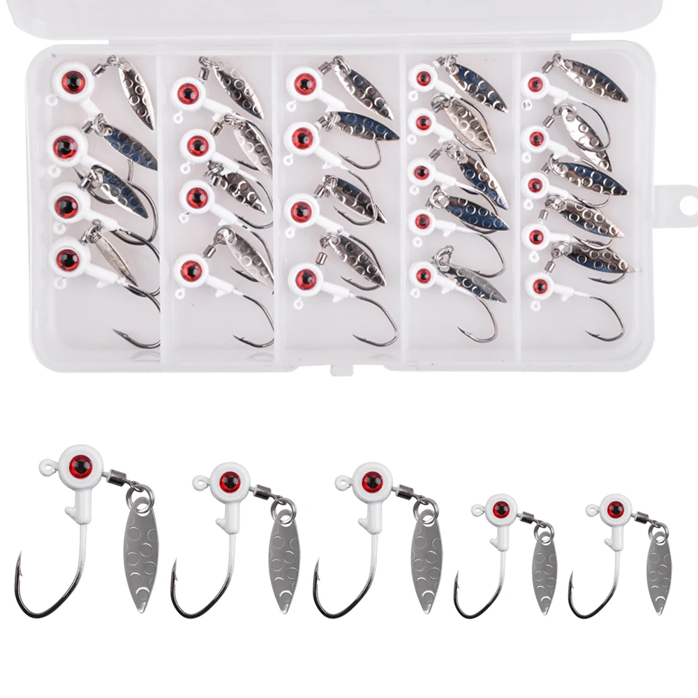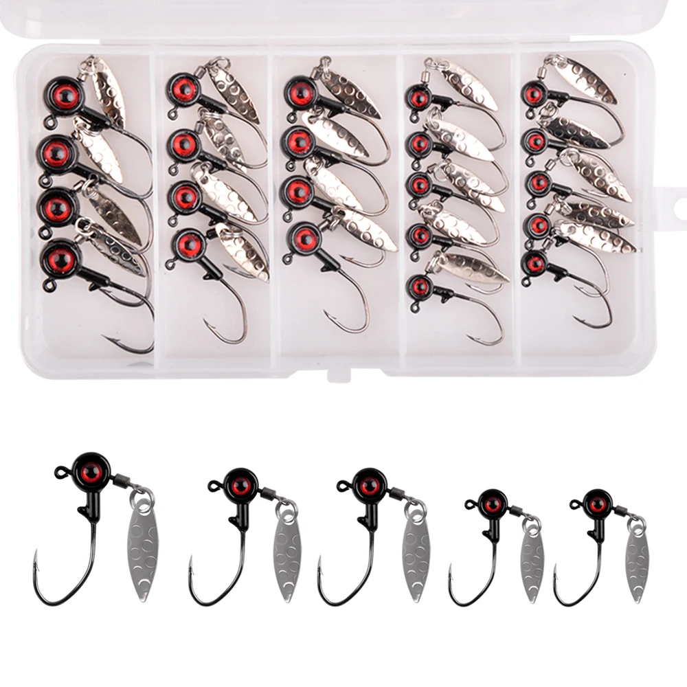 22 piezas Crappie de la cabeza de la plantilla con Spinner 3D los ojos de los peces underspin de la cabeza de la plantilla ganchos bajo trucha Walleye pesca plantilla abordar