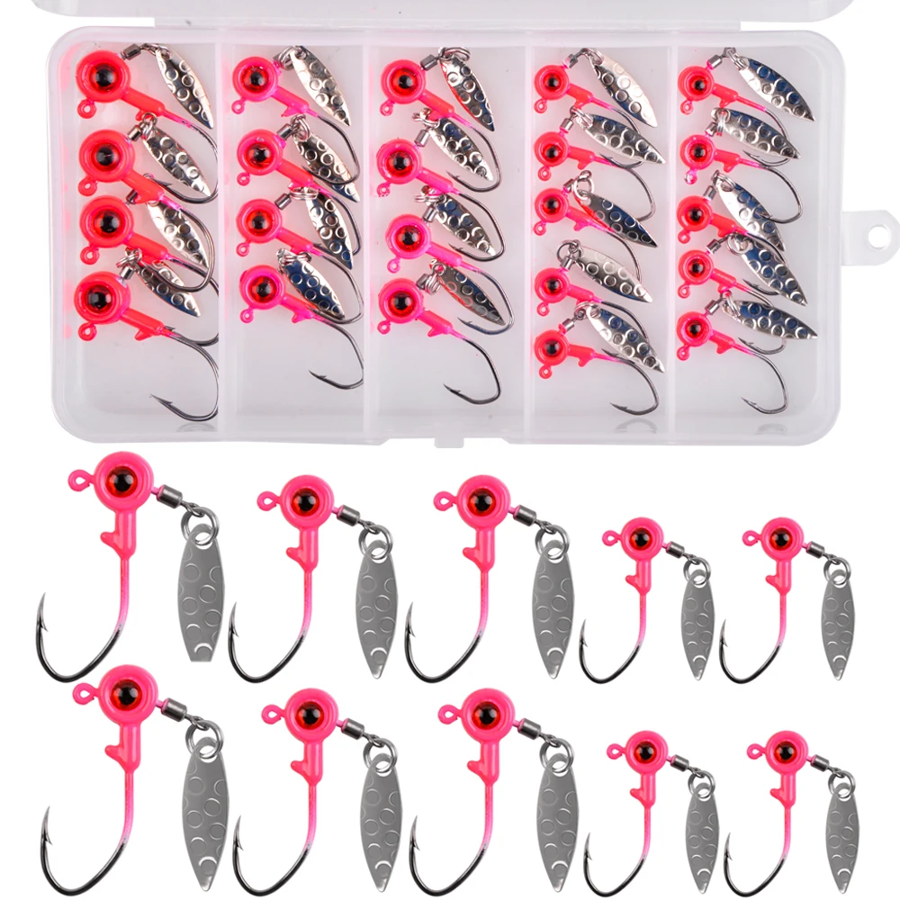 22 piezas Crappie de la cabeza de la plantilla con Spinner 3D los ojos de los peces underspin de la cabeza de la plantilla ganchos bajo trucha Walleye pesca plantilla abordar