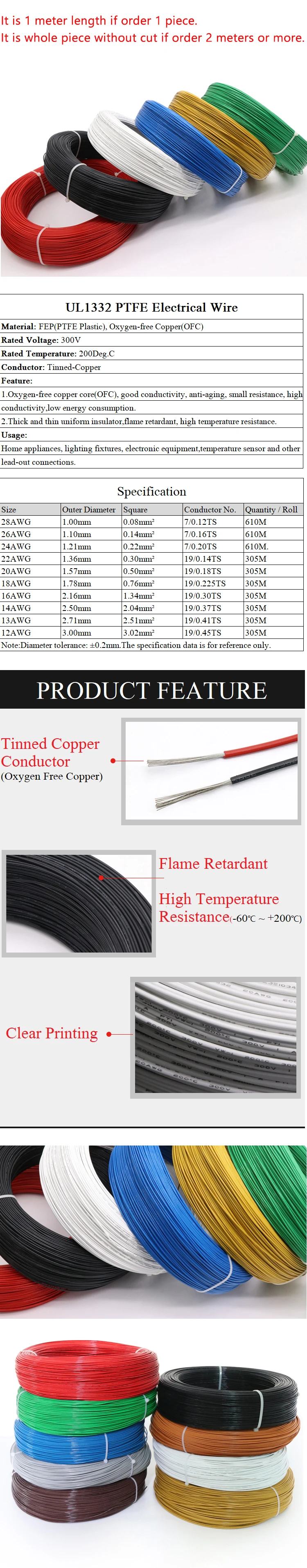 Cable de PTFE UL1332 de 100M, Cable electrónico de alta temperatura con aislamiento de plástico FEP para impresora 3D, 24/22AWG