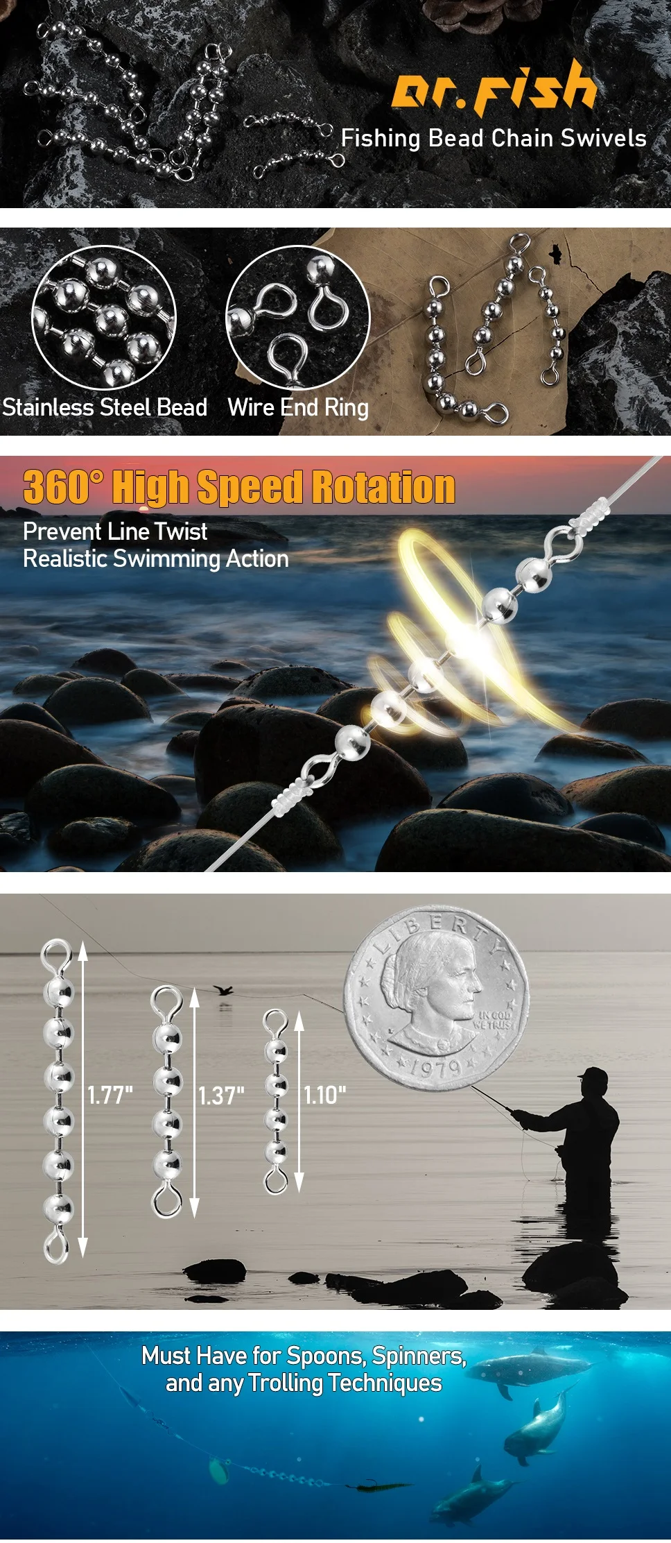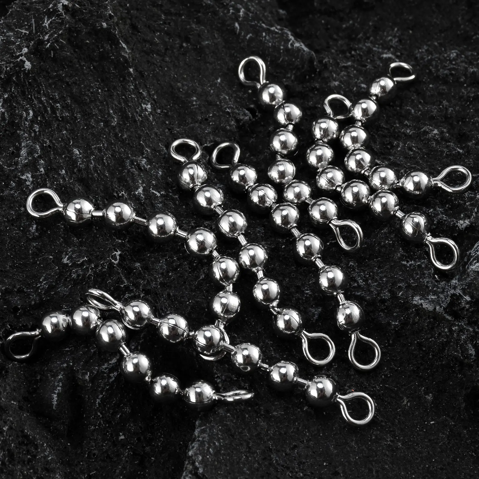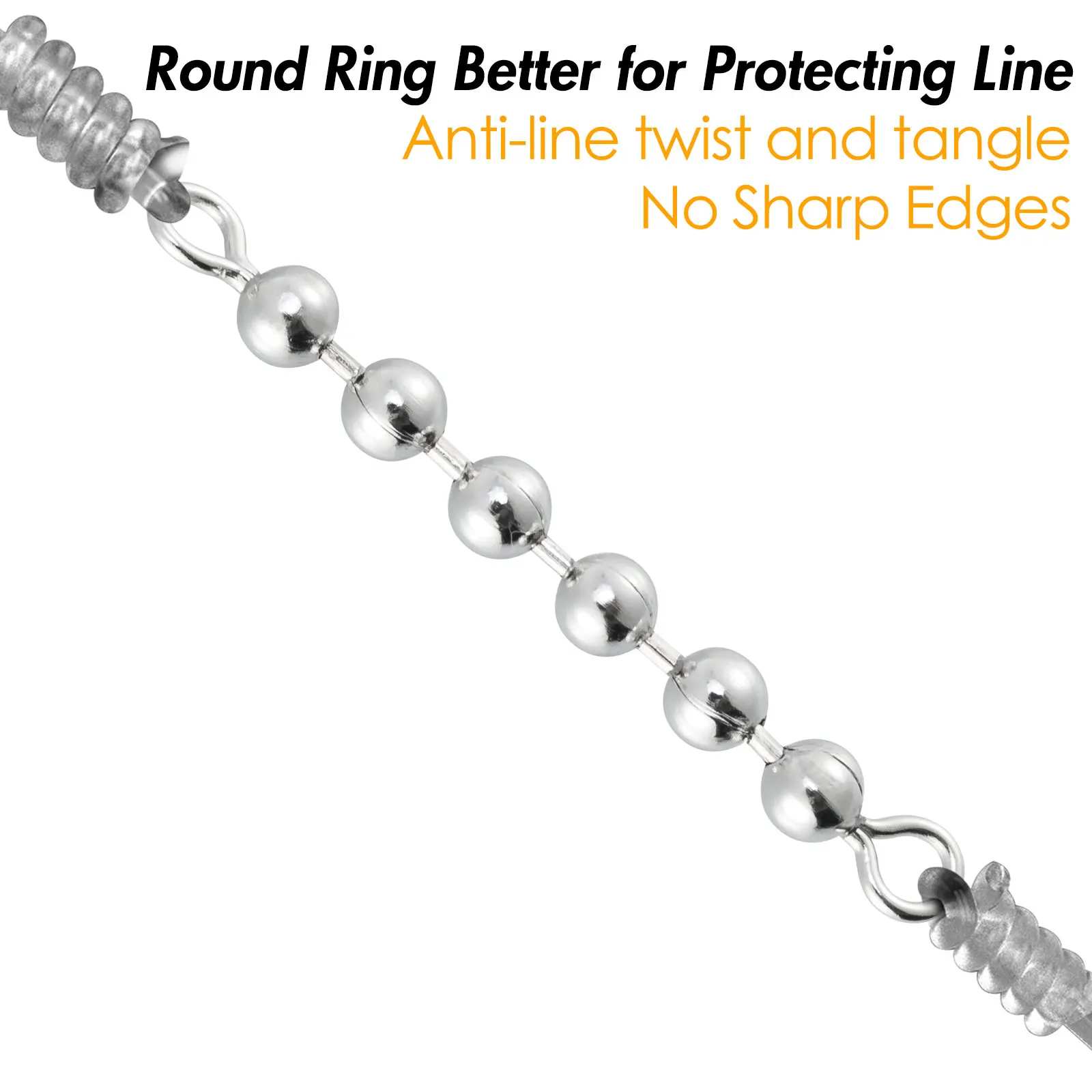 Los eslabones giratorios de cadena de cuentas están hechos de acero inoxidable con anillos de extremo de alambre redondo, por lo que se pueden utilizar en agua salada o dulce.
