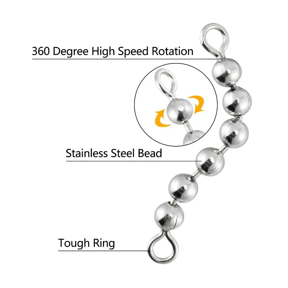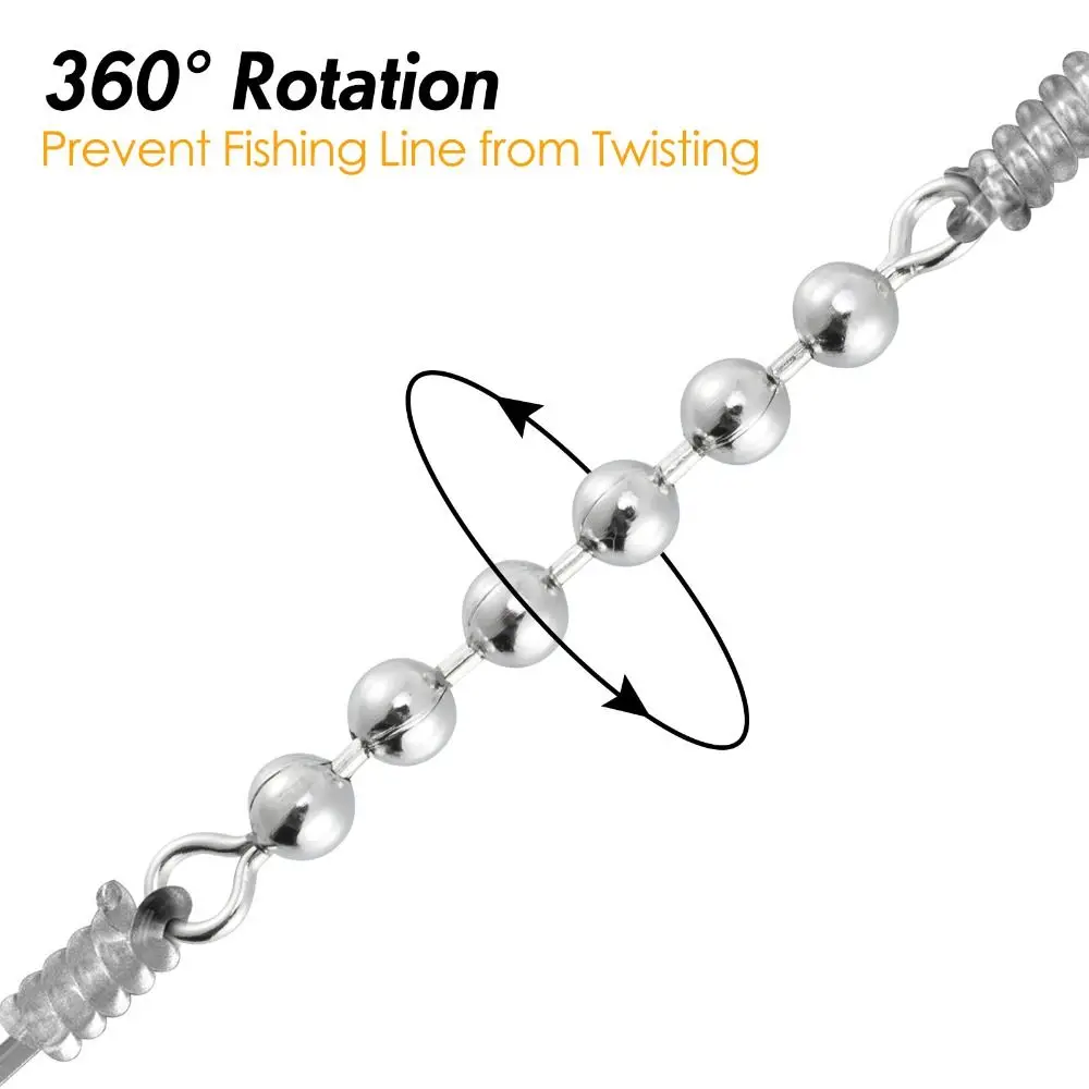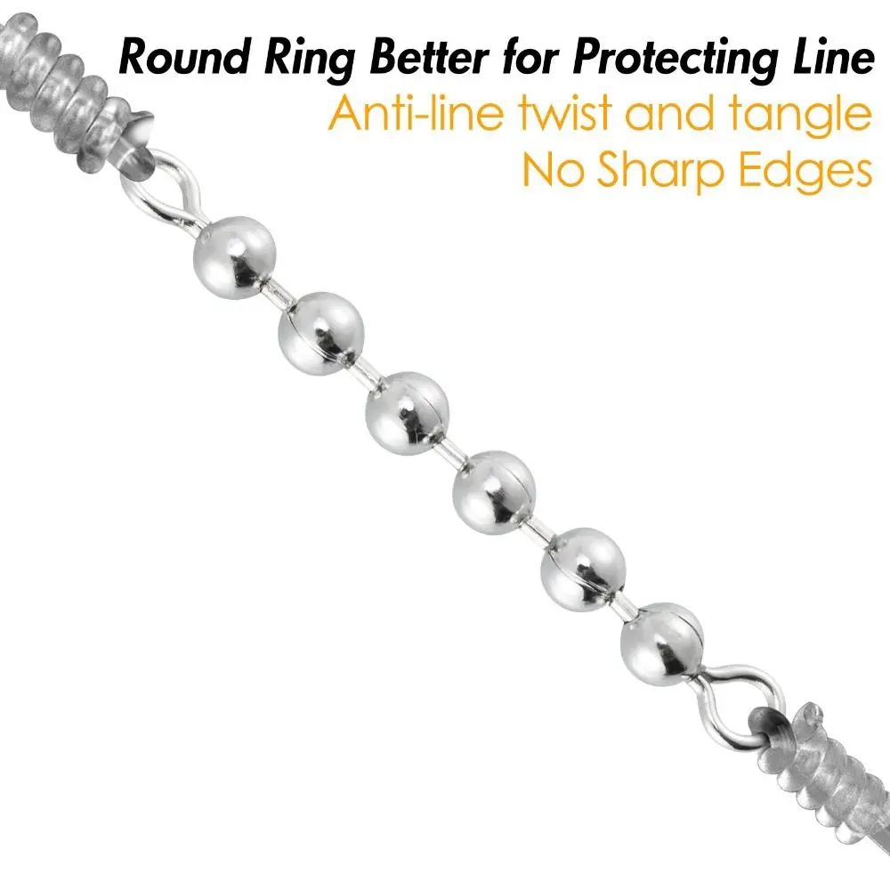 Los giratorios de cadena de cuentas están hechos de acero inoxidable con anillos de extremo de alambre redondo, por lo que se pueden usar en agua salada o dulce.