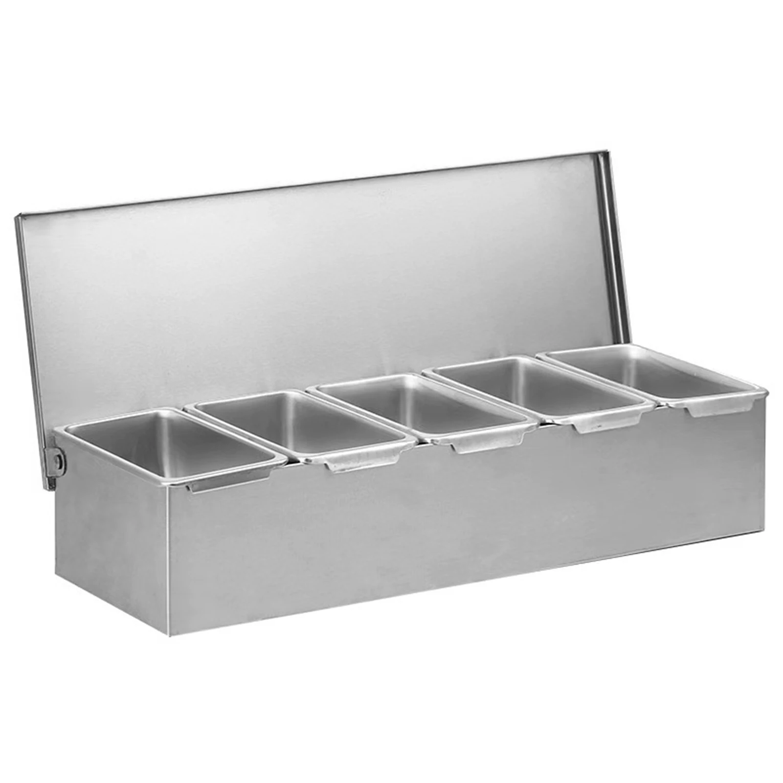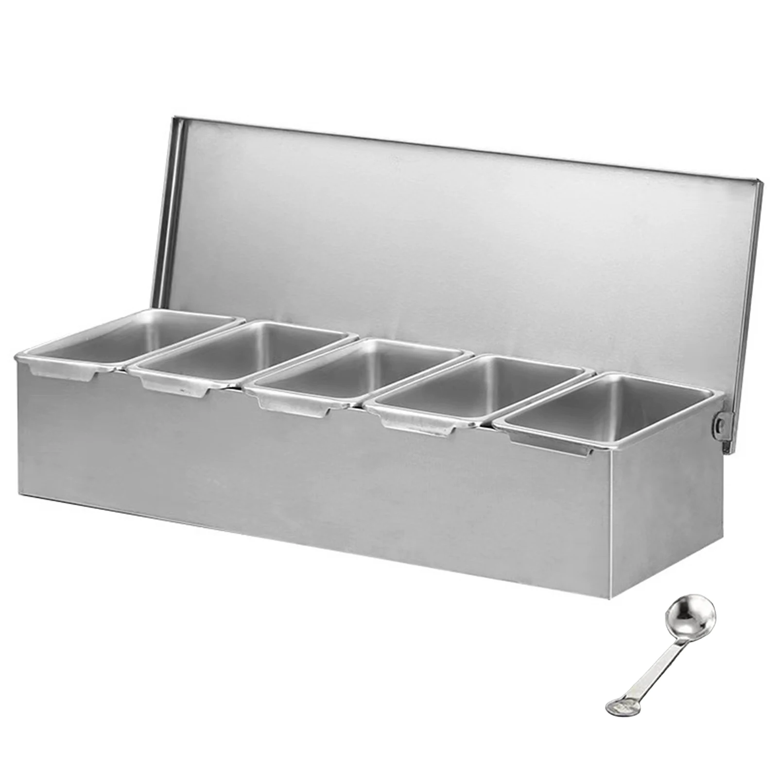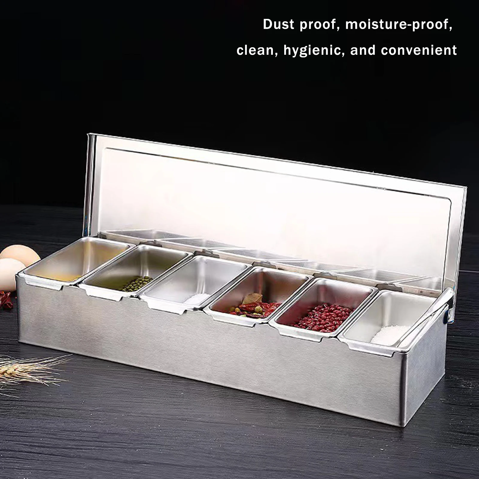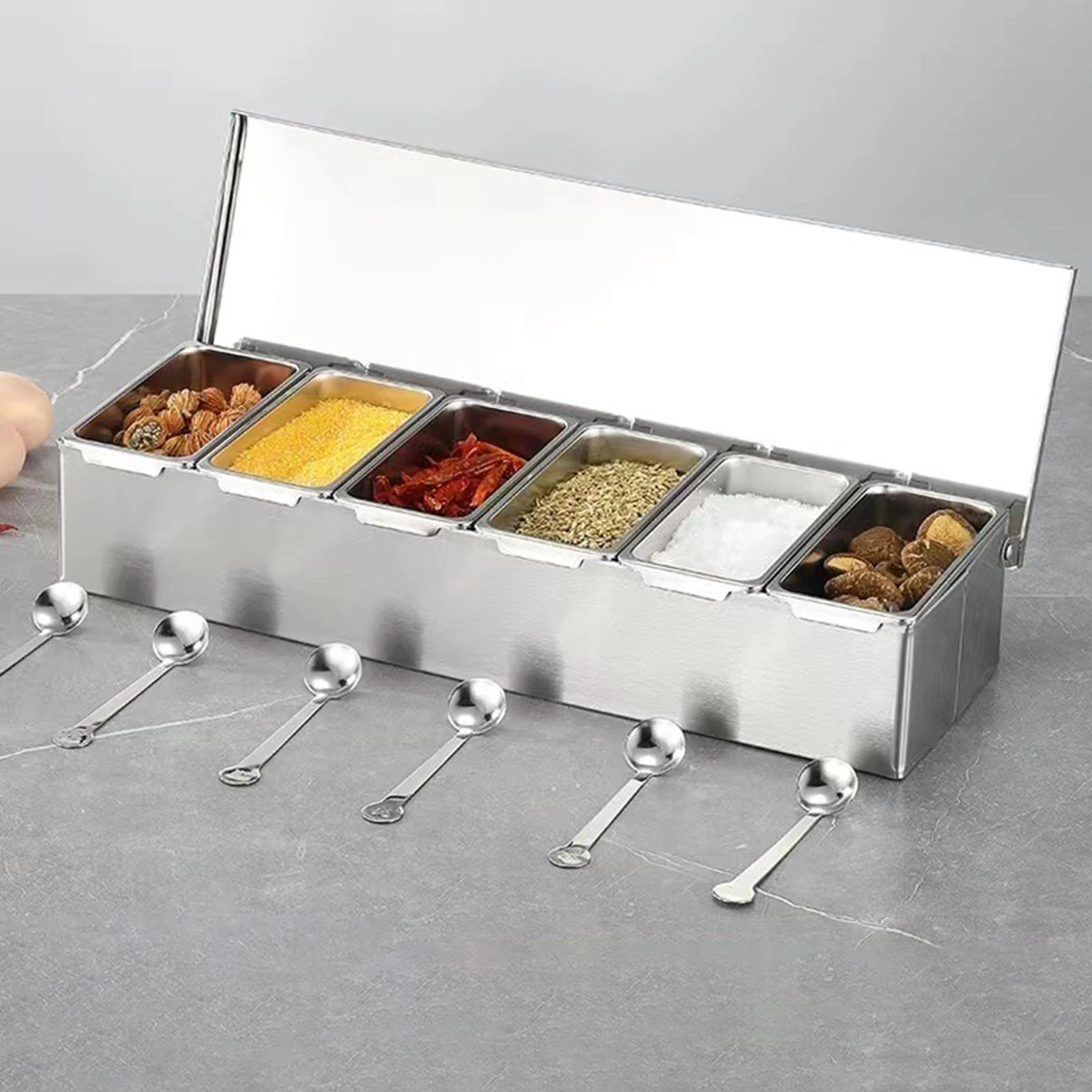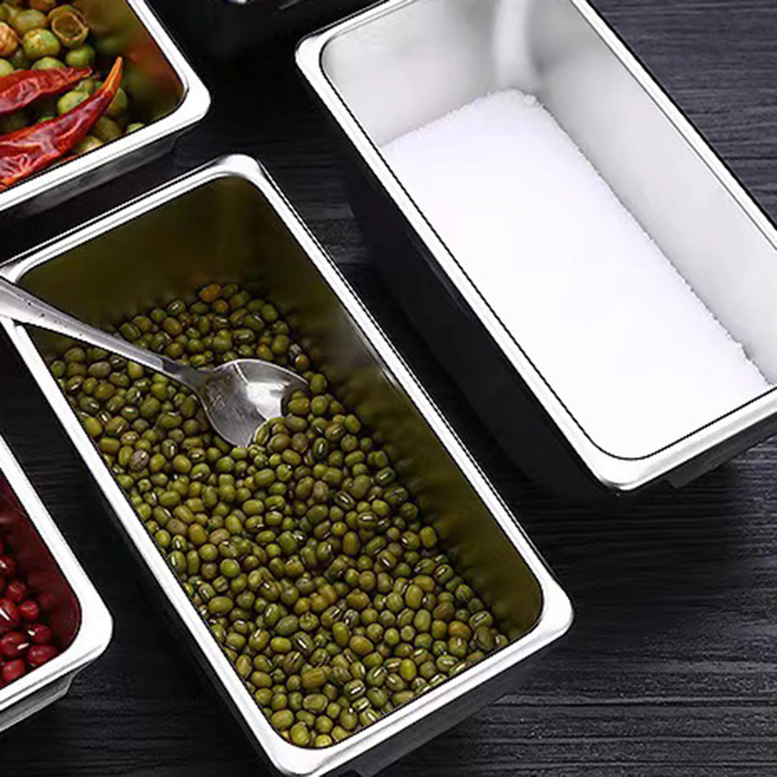 Construcción de acero inoxidable de primera calidad: esta caja de condimentos está hecha de acero inoxidable de buena calidad, lo que garantiza durabilidad y un uso duradero en su cocina.