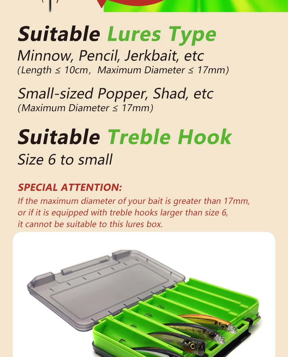 Esta caja de señuelos es adecuada para pececillos delgados medianos y pequeños, lápiz, jerkbait,