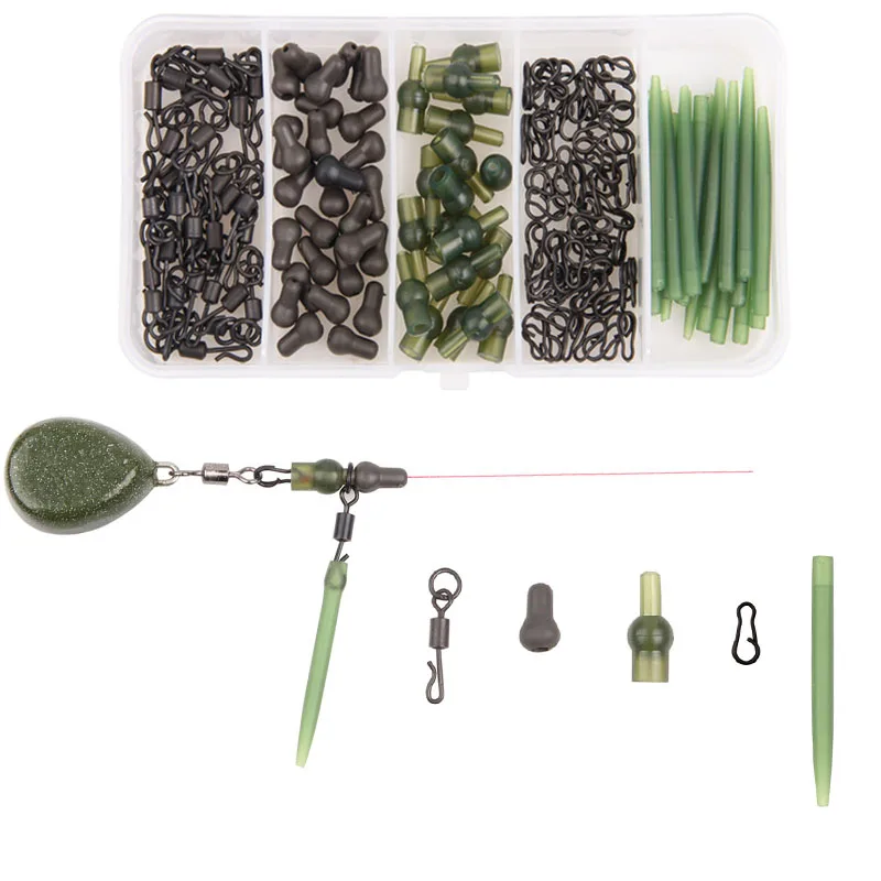 Cantidad: 100 piezas 150 piezas Paquete: caja de plástico Color: color al azar Material: caucho suave, hierro mate Característica: Juego de aparejos esenciales para pesca de carpa, fácil de usar Tubo de goma suave, eslabones giratorios a presión anticorrosión, conector perfecto Paquete de caja de plástico, fácil de llevar Nota: puede haber algunos errores de medición, no se preocupe. Gracias