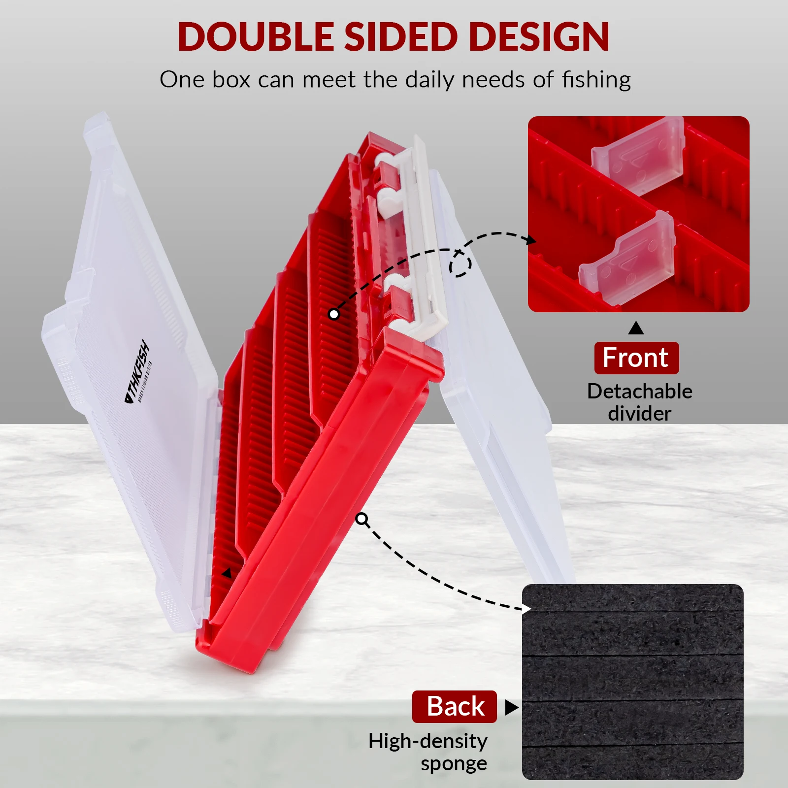 Caja de aparejos de doble cara: El diseño único con doble cara proporciona más espacio y comodidad para que usted maneje el equipo de pesca. Los compartimentos frontales de la caja de aparejos se pueden ajustar mediante las divisiones adjuntas para separar múltiples compartimentos de diferentes tamaños. El diseño de la tira de esponja en la parte posterior es perfecto para almacenar cabezales de plantilla, equipo de pesca con mosca, etc. Es seguro y firme, y mantiene los anzuelos afilados en todo momento. Atención: El paquete Incluye caja de aparejos, ¡el otro equipo de pesca no está incluido!