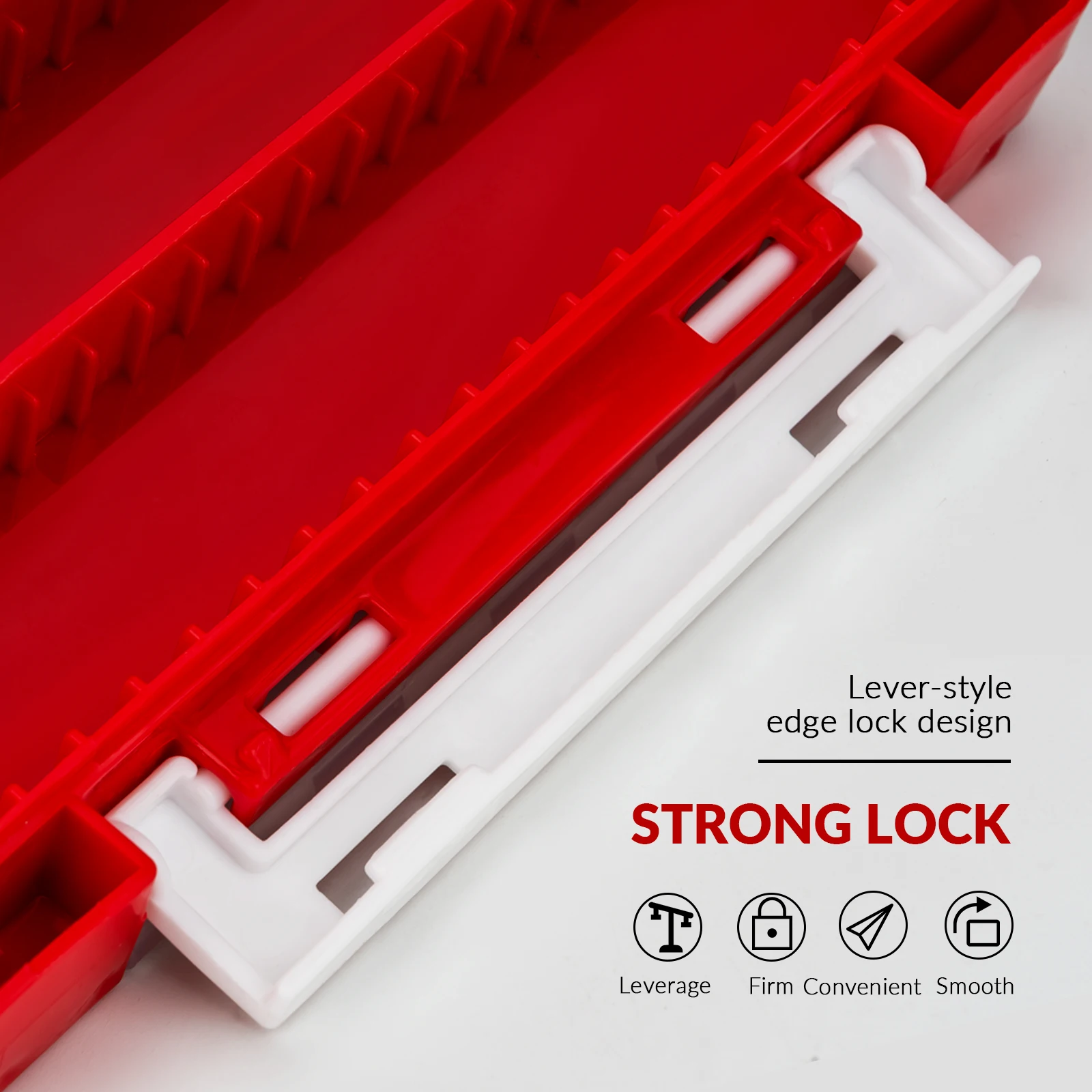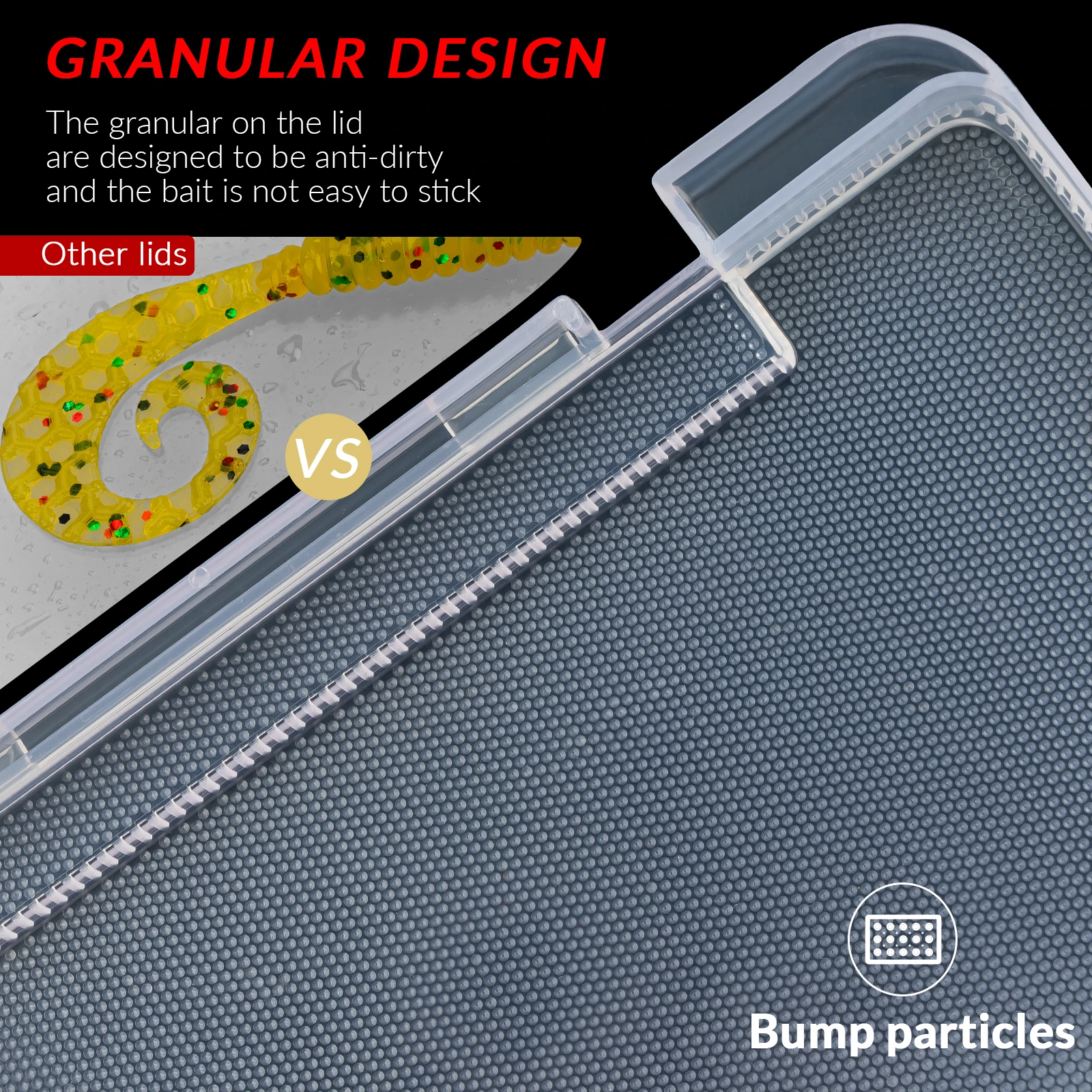 Diseño de detalle único: tapa de plástico translúcido para una identificación rápida y fácil del contenido. El diseño granular evita que el cebo blando se pegue a la tapa y evite que el cebo se caiga mientras se abre la caja de pesca terminal. El gran pestillo de seguridad en ambos lados es sólido y duradero, no tiene que preocuparse por dañar y romper fácilmente o por que los aparejos de pesca se salgan. Emparejado con ejes de acero inoxidable para una apertura y cierre más suaves.