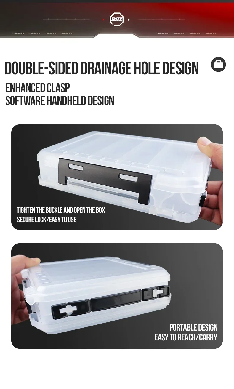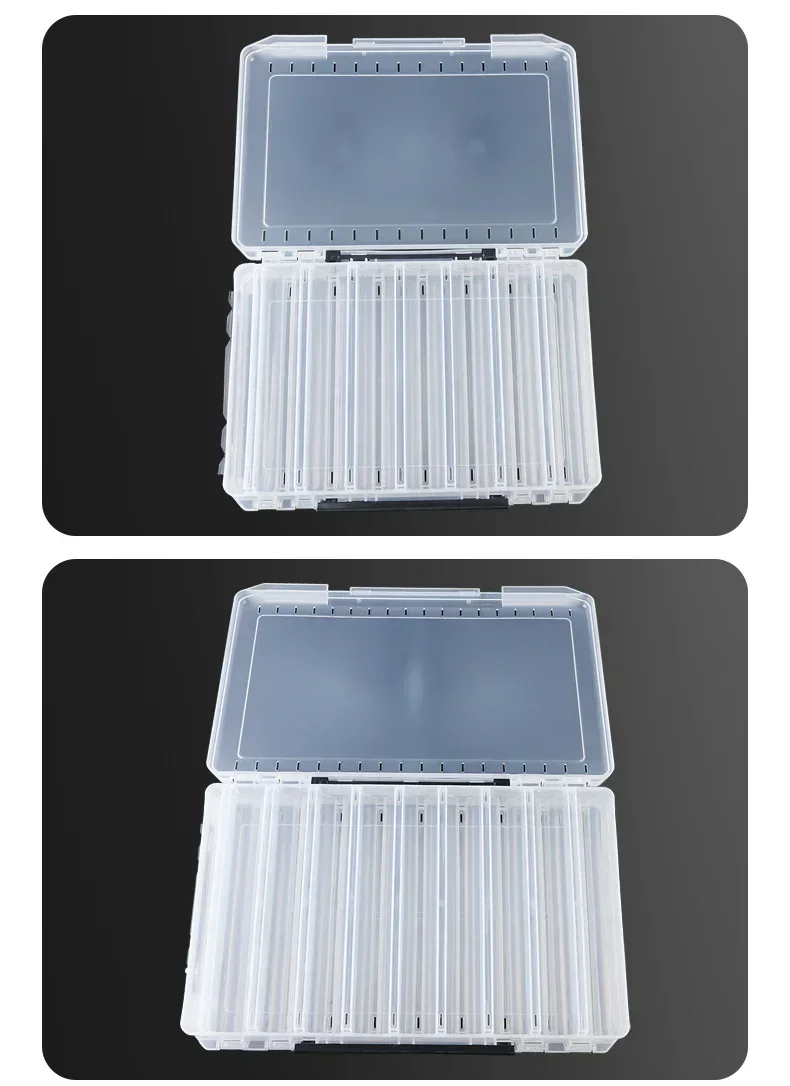 【Características】: Esta caja tiene un gran espacio de almacenamiento y puede almacenar 10 /14/18 señuelos grandes en ambos lados, ya no tendrá que preocuparse de que la caja que compre sea demasiado pequeña para guardar sus señuelos.