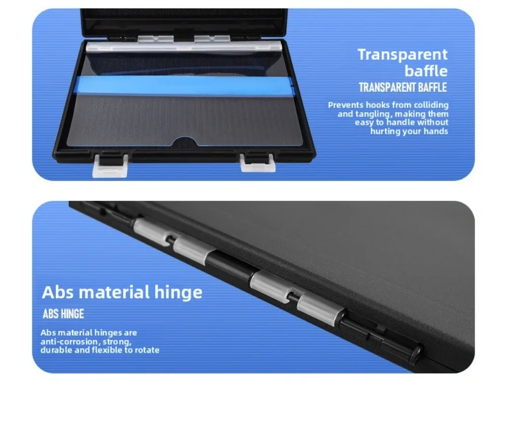 2. Diseño de partición transparente: la caja de aparejos de pesca cuenta con divisores transparentes que evitan eficazmente que los cebos pequeños se peguen y se enreden entre sí, asegurando la integridad de su cebo y mejorando su experiencia de pesca.