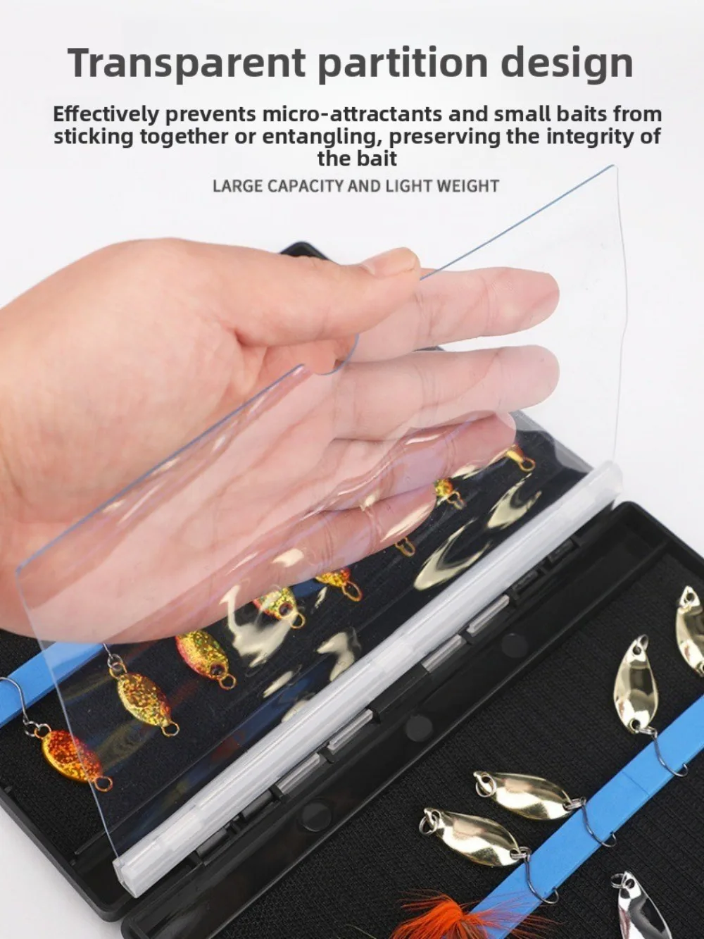 2.Transparent Partition Design: The fishing gear box features transparent dividers that effectively prevent small baits from sticking and tangling with each other, ensuring the integrity of your bait and enhancing your fishing experience.