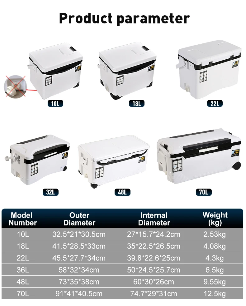 • Gran Capacidad:Esta caja del refrigerador de la pesca ofrece una gama de capacidades de 10L a 48L, proporcionando el almacenamiento amplio para sus artes y herramientas de pesca.
