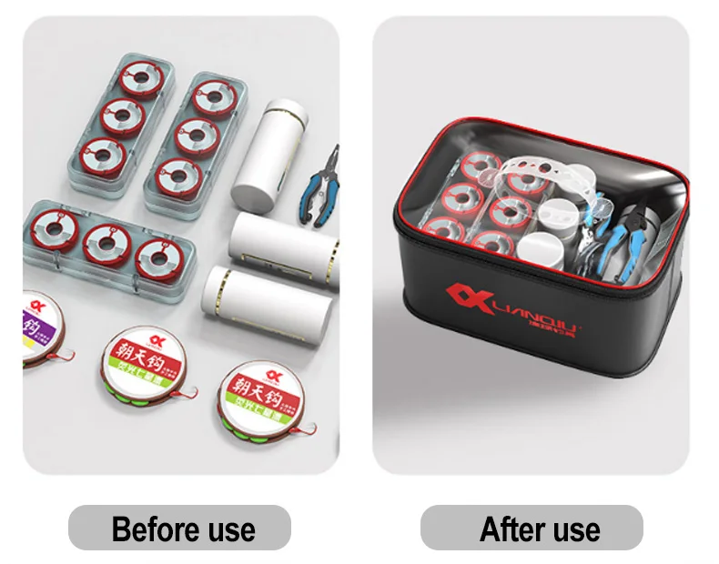 6.Gran capacidad, multiusos, se puede utilizar para colocar aparejos de pesca, hilo de pescar, cebos, bolsas de agua, varios accesorios pequeños, etc.