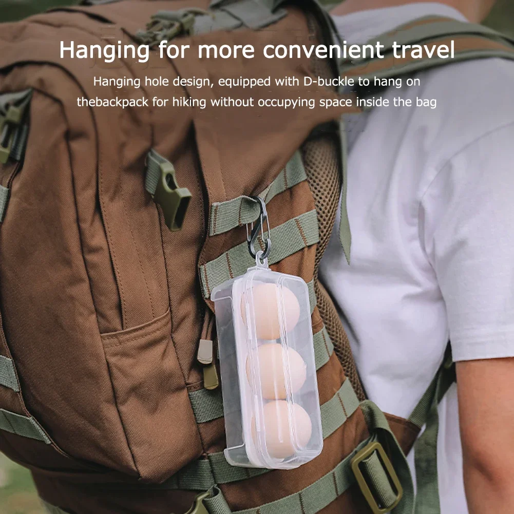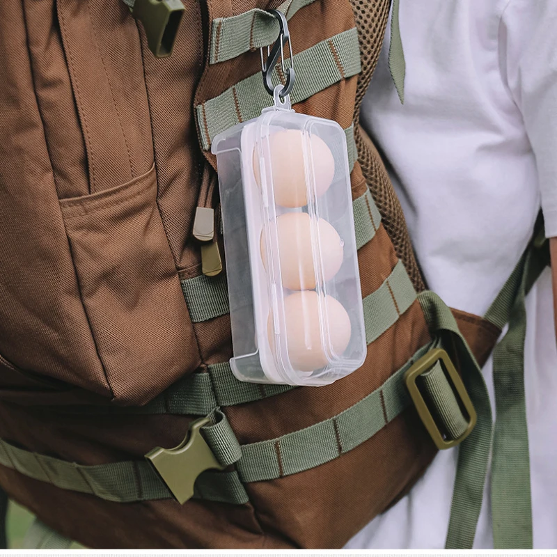5.Práctico diseño de orificio para colgar:El diseño de orificio para colgar, junto con una hebilla en D que cuelga de la mochila, lo que hace que este estuche contenedor de cocina con soporte para huevos sea ideal para actividades al aire libre como caminatas y campamentos.Libera espacio dentro de la bolsa mientras mantiene sus huevos u otros artículos al alcance de la mano.