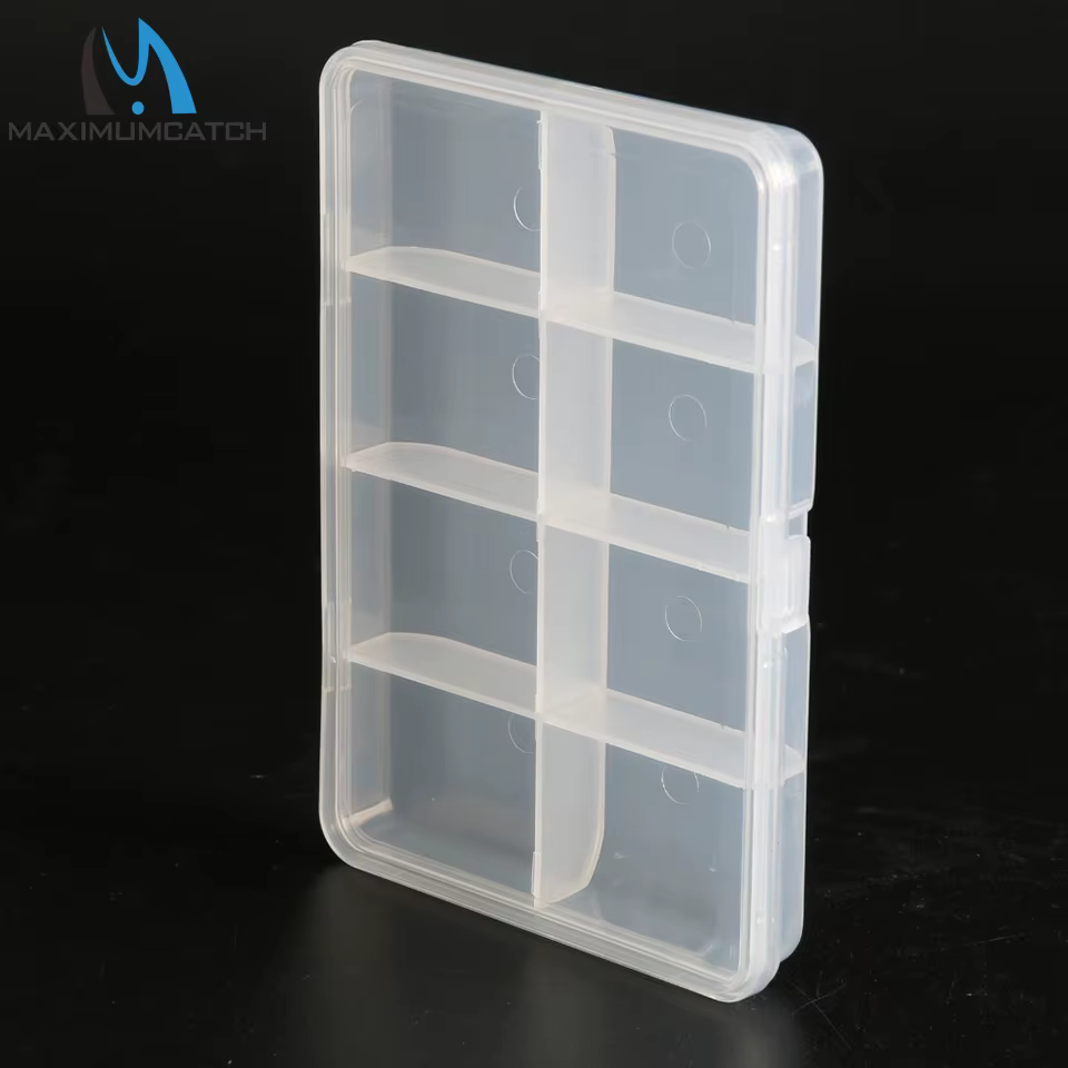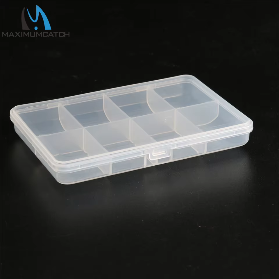 Caja para moscas transparente Maximumcatch HB08 - Almacenamiento de plástico con 8 compartimentos ajustables para aparejos de pesca con moscas secas/ninfas