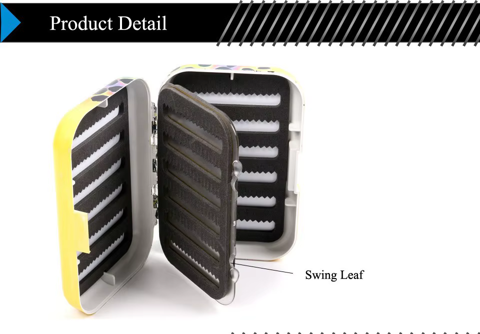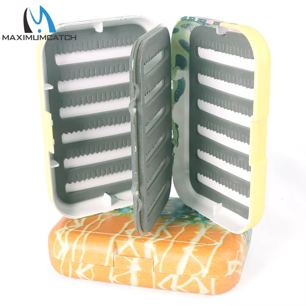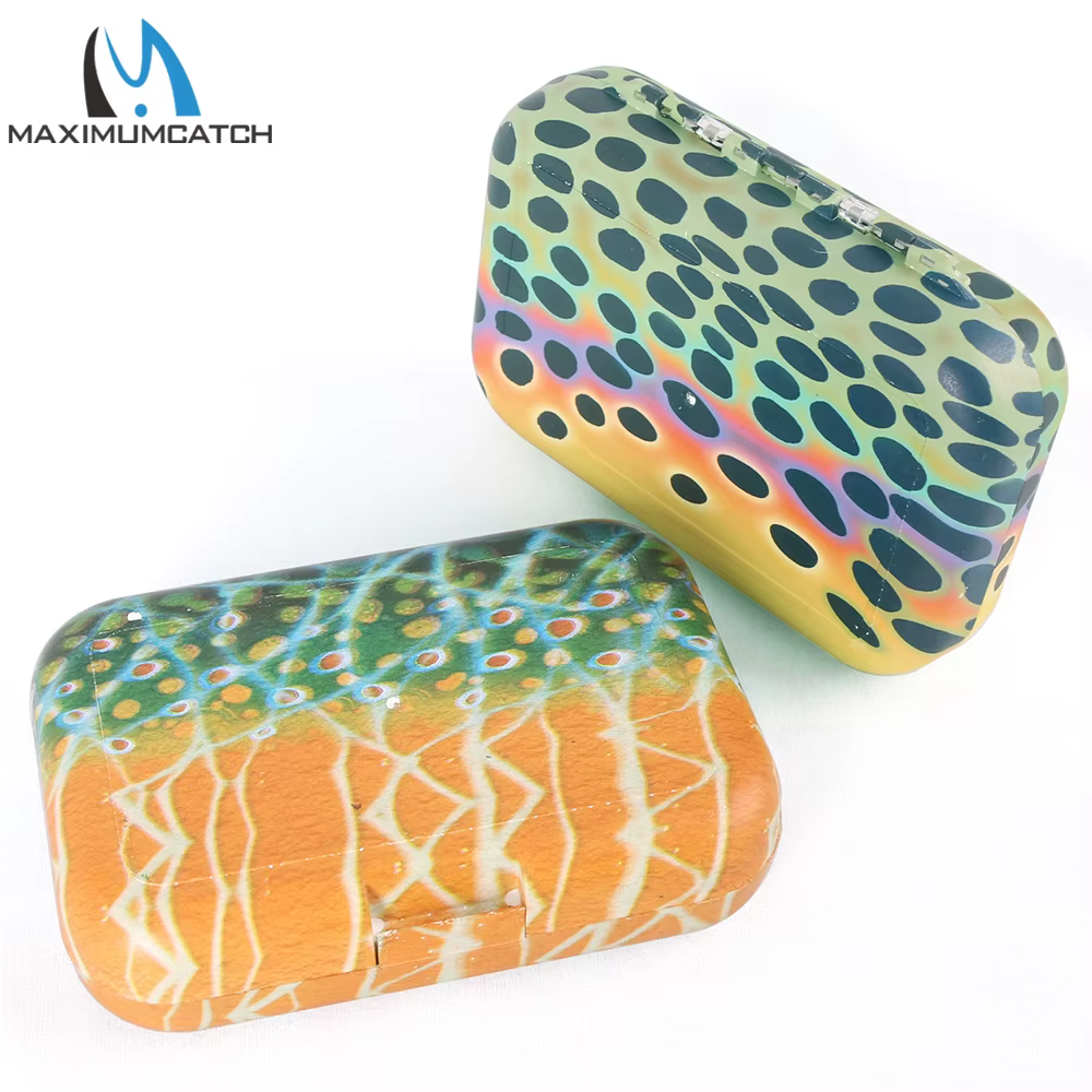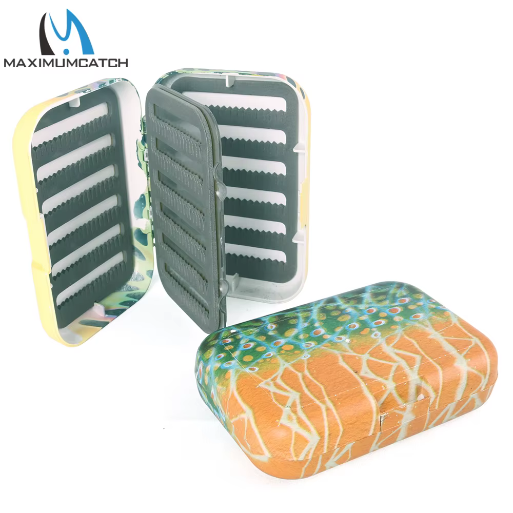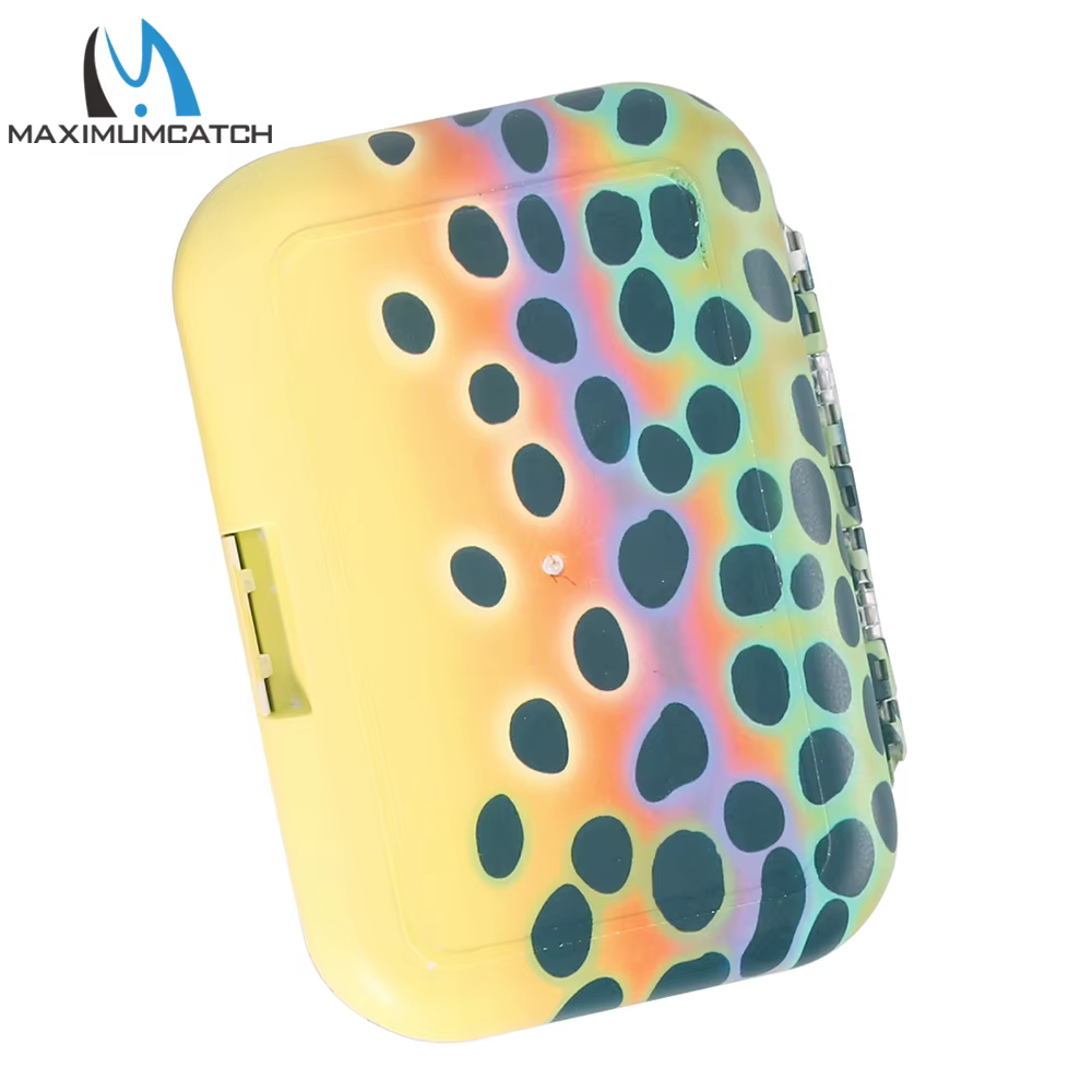 Caja de pesca con mosca Maximumcatch con inserto de espuma con hendidura de hoja oscilante, piel de trucha, caja de aparejos de pesca