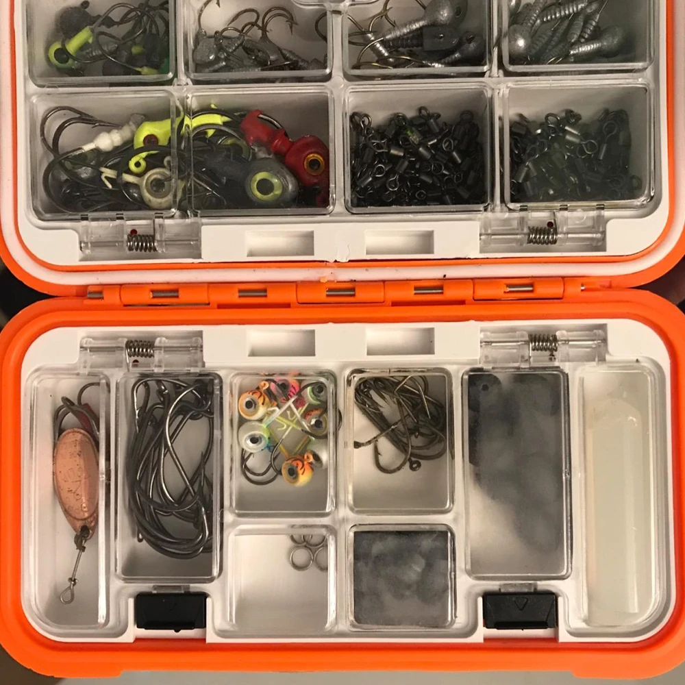 La caja de aparejos de pesca está hecha de un marco grueso y resistente, que puede proporcionar a los pescadores una solución duradera de almacenamiento y clasificación para resolver los problemas de cebo duro, plástico, aparejos de pesca y herramientas.Los resistentes pestillos moldeados mantienen las cosas seguras.