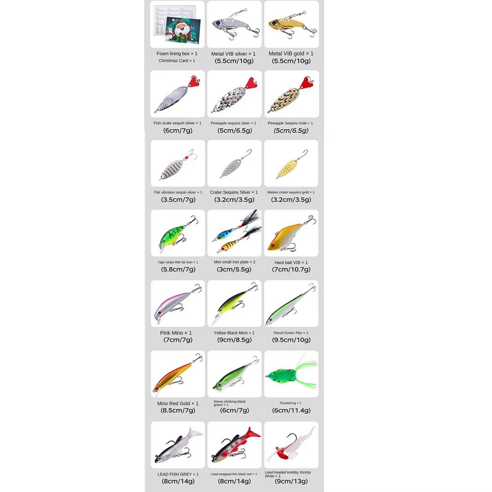 Discover the joy of fishing with our 2024 fishing lure box advent calendar. Carefully selected for 24 days , each box opens to reveal a new fishing item. Specification.