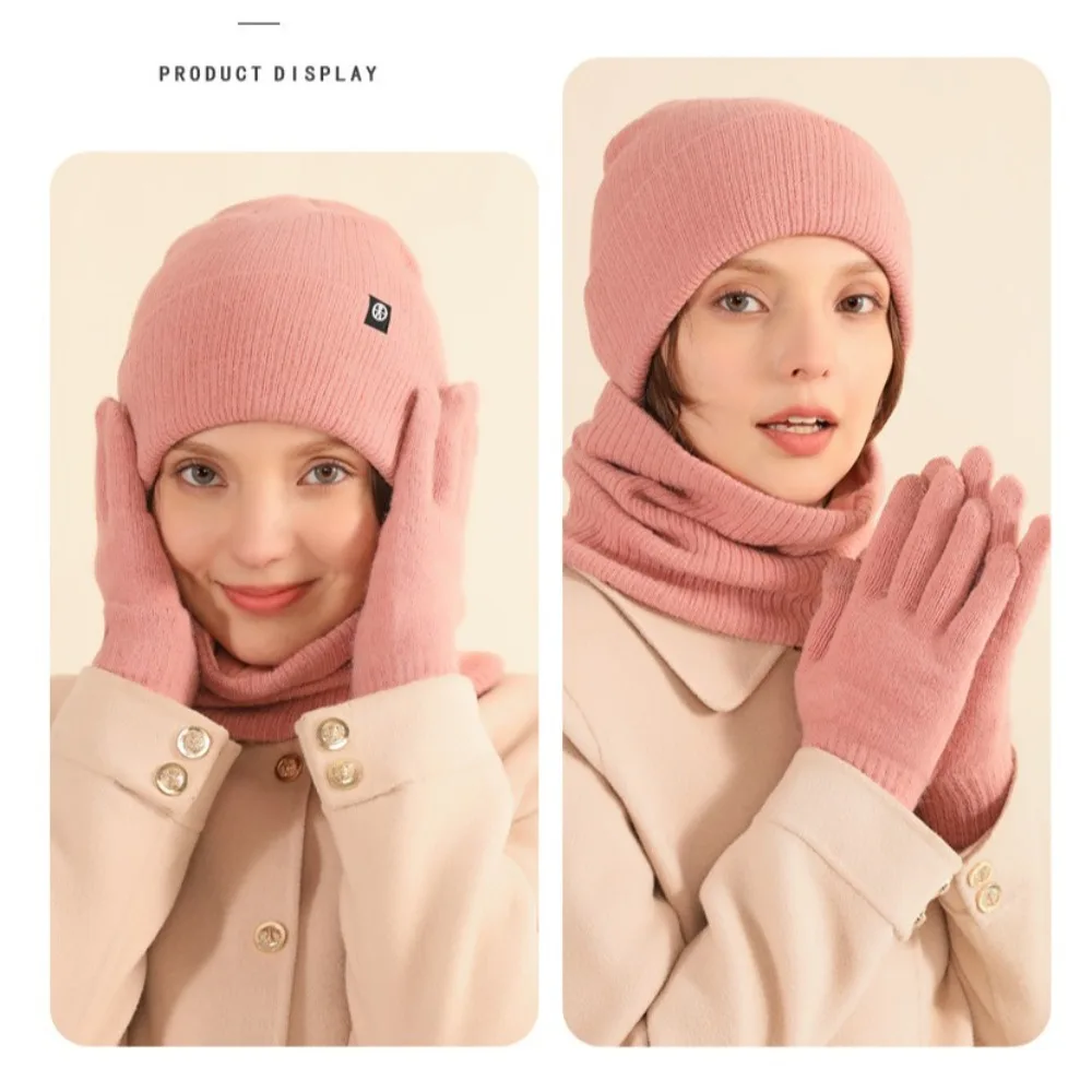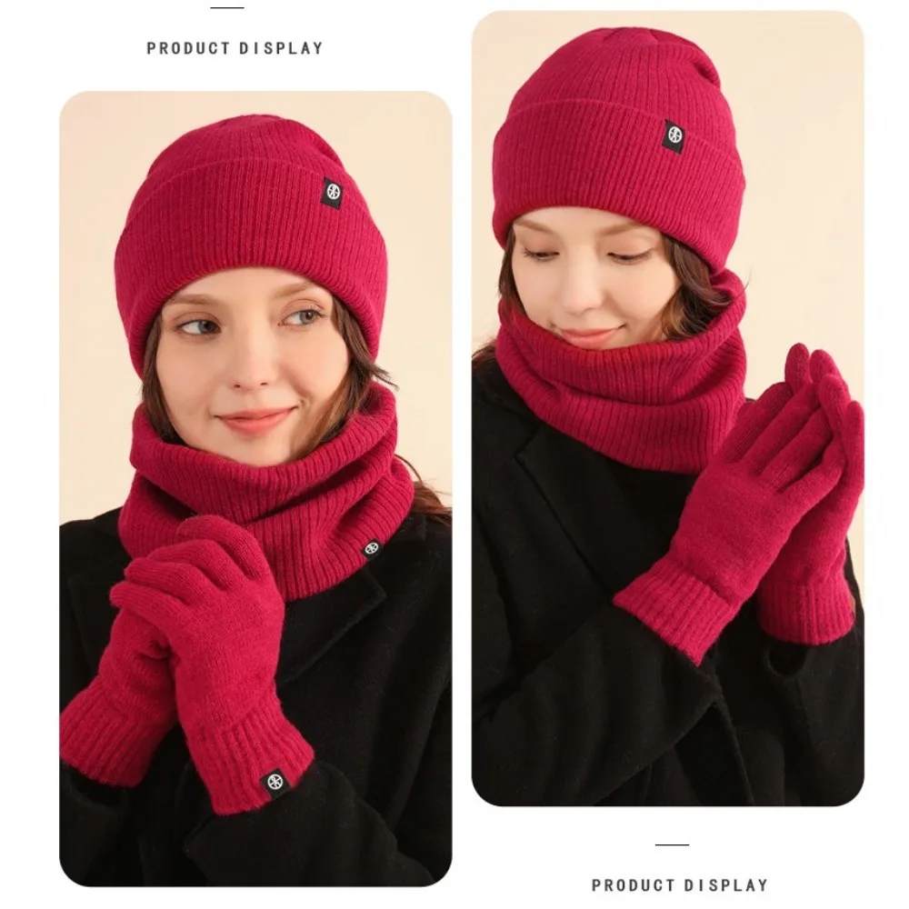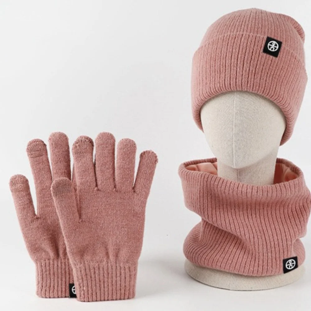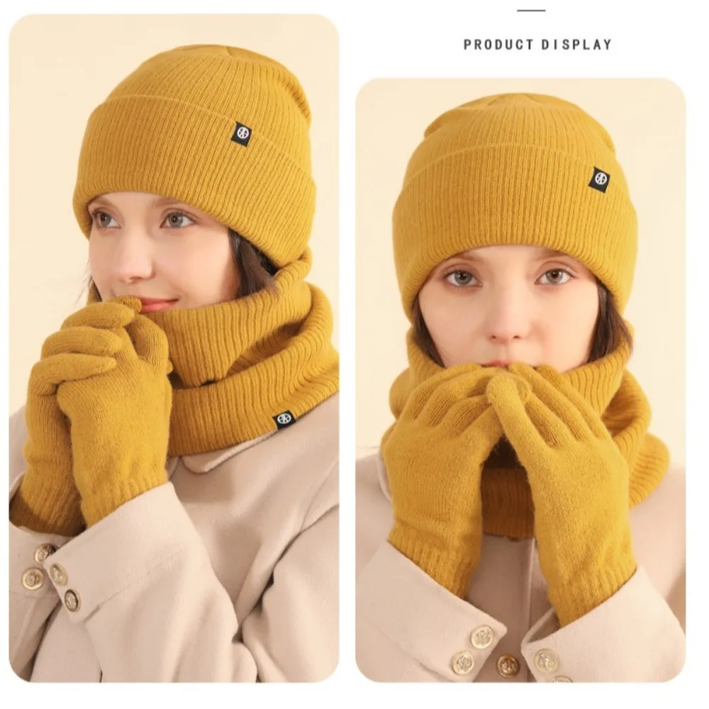 Three-piece hat, scarf, and gloves set for ultimate winter warmth and style.