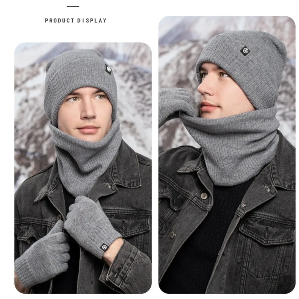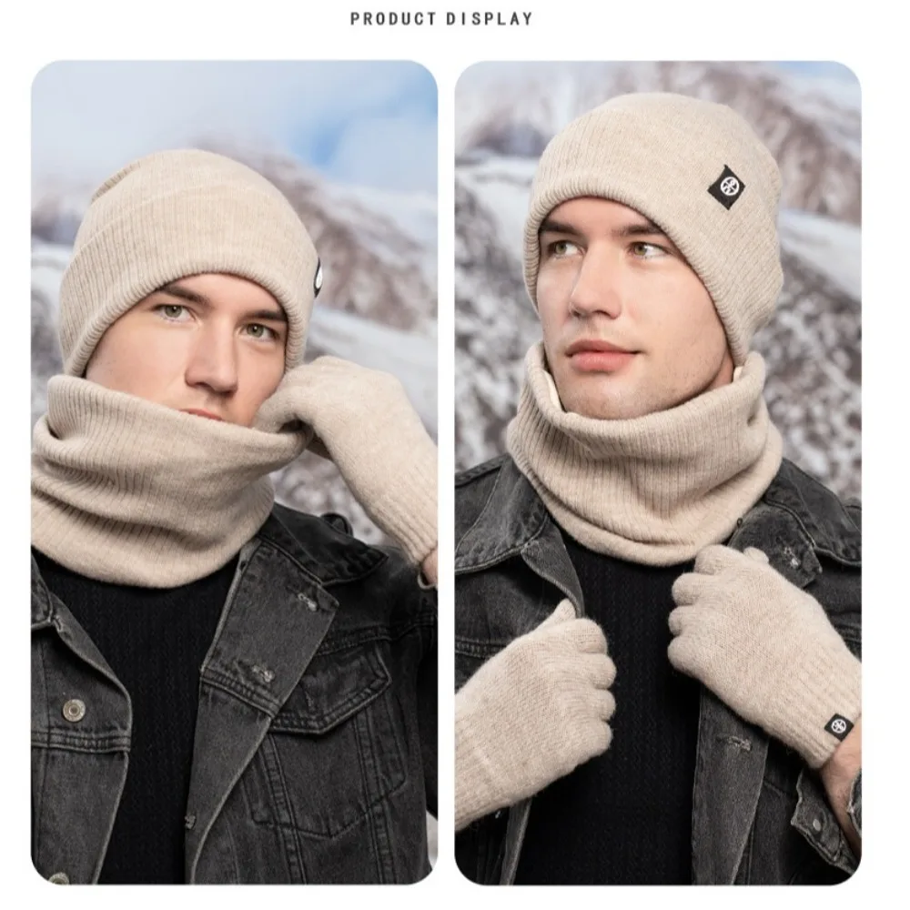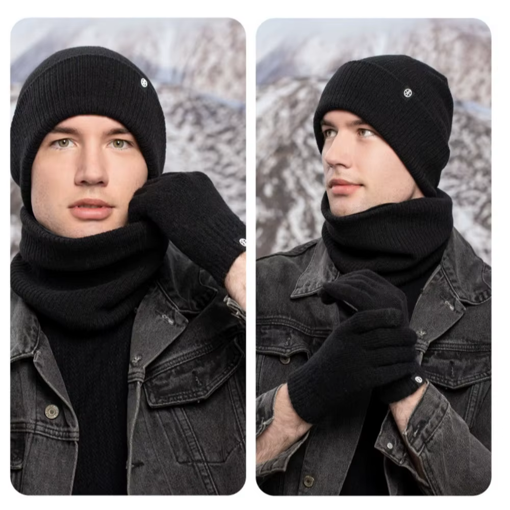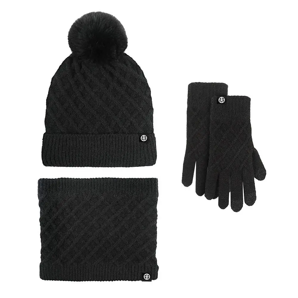 Three-piece hat, scarf, and gloves set for ultimate winter warmth and style.