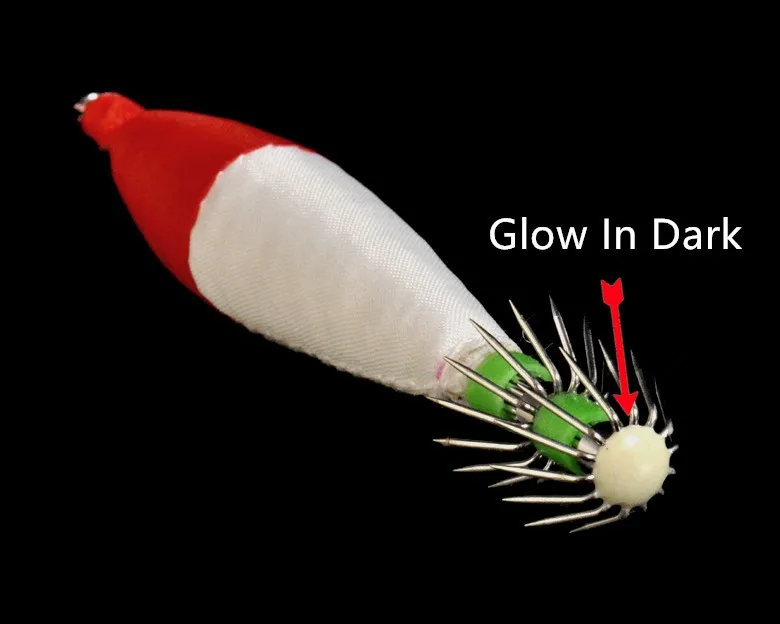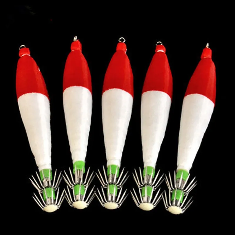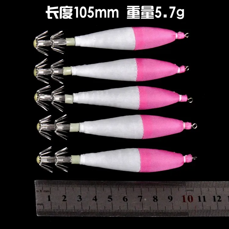 Gancho de plástico para camarones y calamares, camarones de madera que brillan en la oscuridad 4# Juego de señuelos de pesca en rollo de tela, 5 piezas