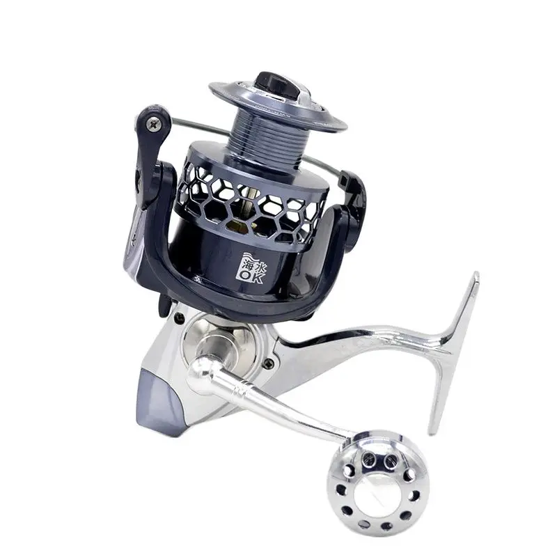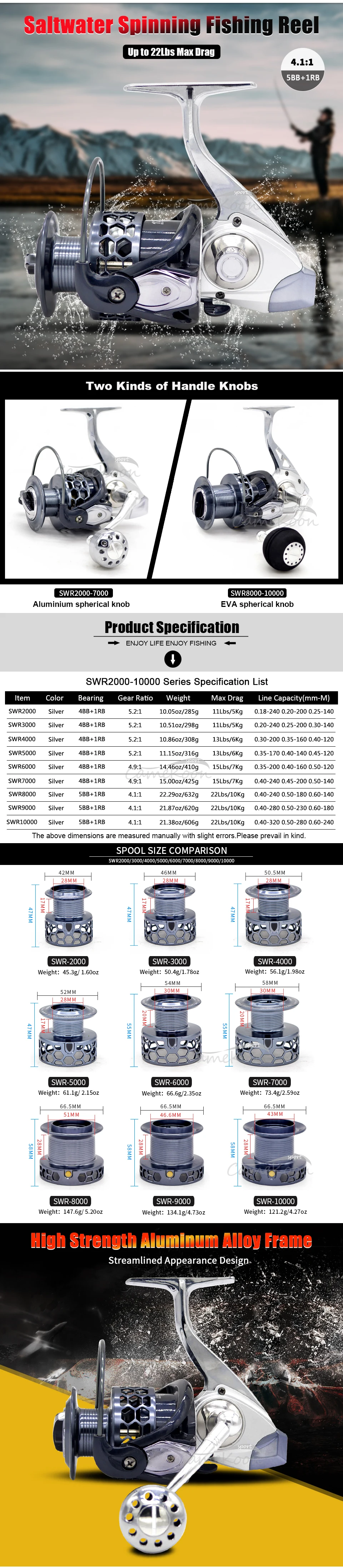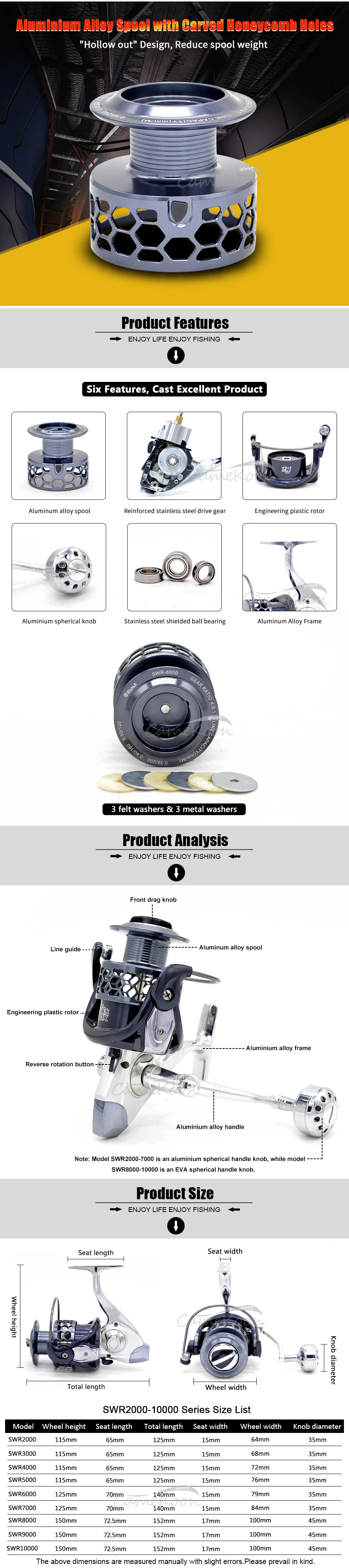 DISEÑO-El carrete de aluminio mecanizado CNC con agujeros de panal tallados hace que este carrete giratorio sea más hermoso y liviano. Mango de plegado rápido izquierdo o derecho intercambiable con perilla esférica de aluminio o perilla antideslizante de EVA, todo está en la palma de su mano.Aviso: el modelo es una perilla de mango esférico de aluminio, mientras que el modelo SWR8000-10000 es una perilla de mango esférico de EVA.