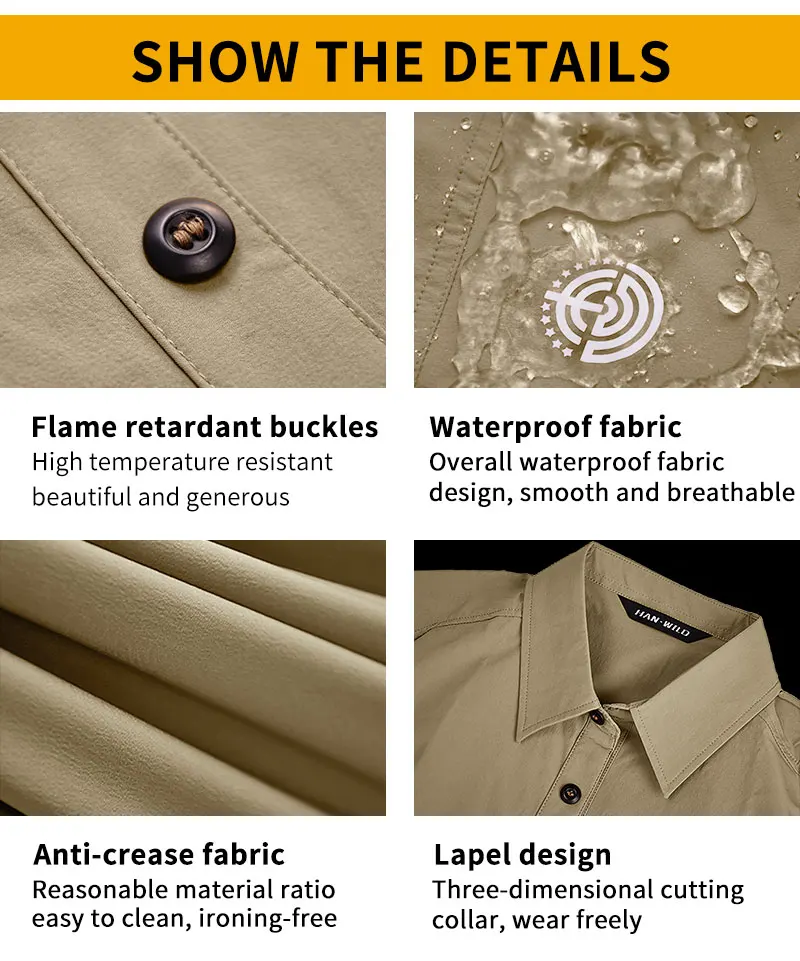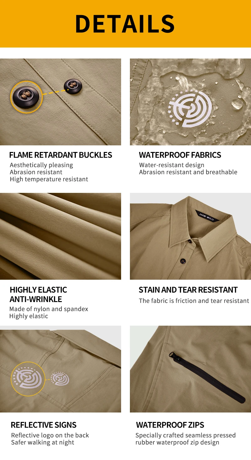 2. Secado rápido/Fácil lavado/Sin decoloración3. Forma estereoscópica del cuerpo4. Impermeable/a prueba de viento/resistente al desgaste/Ripstop5. 2 bolsillos de gran capacidad6. Cremallera impermeable adhesiva sin costuras