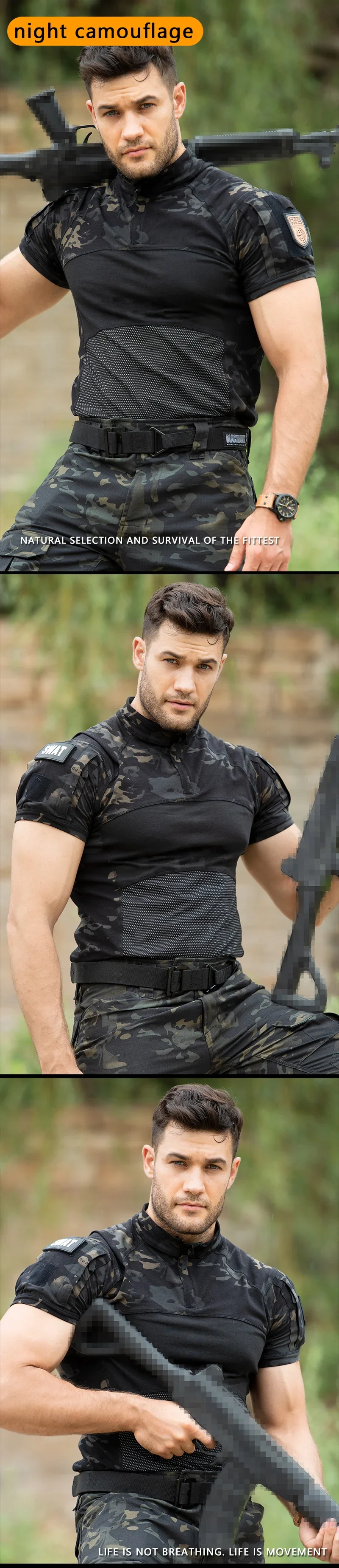 Camiseta de verano para hombre al aire libre, camisetas tácticas Airsoft, camiseta de algodón de camuflaje de manga corta de combate elástico, ropa de escalada para senderismo y Paintball