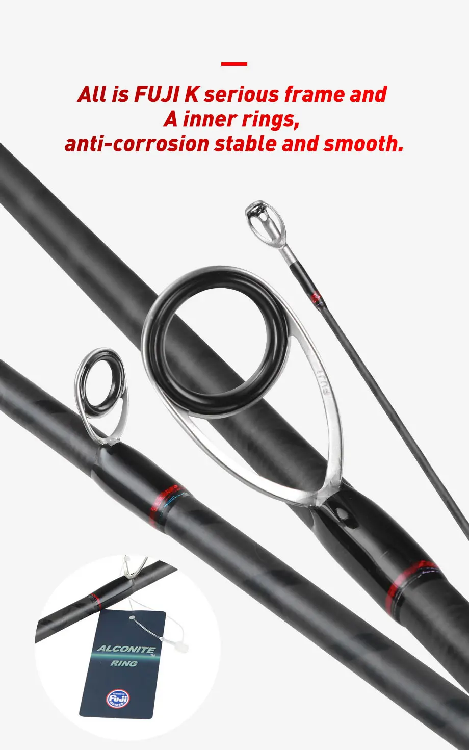 • Anillos Fuji Varilla de carbono 40T:La varilla de carbono Fuji con anillos 40T agrega resistencia y durabilidad adicionales a la caña, lo que la convierte en una opción confiable para cualquier pescador.