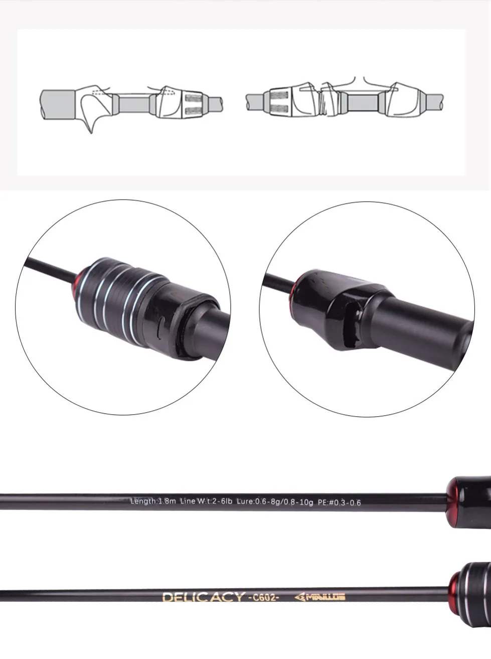 Longitud: 1,8 m|Longitud cerrada: 95cm|Peso: 100,2G|Peso del señuelo (hueco/sólido): 0,8-10g/0,6-8g|Peso de la línea: 2-6lb|Acción (hueco/sólido): rápido/lento|Potencia (hueco/sólido): L/UL|Consejos: 2 puntas huecas + sólidas|Diámetro inferior: 7,01mm|Diámetro superior (Hueco/sólido): 1,65mm/0,74mm|Sección: 2|
