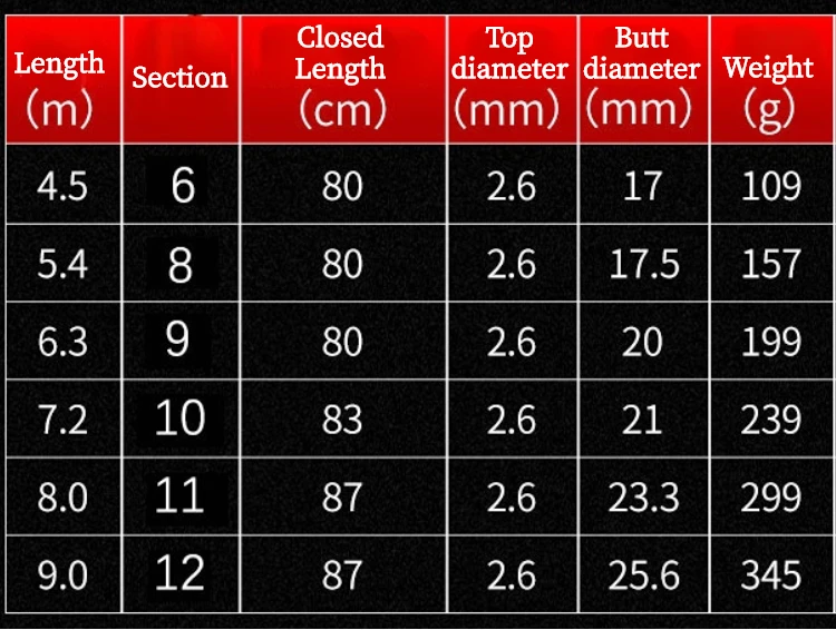 Longitud: 4,5-10m Longitud cerrada: 80-87cm