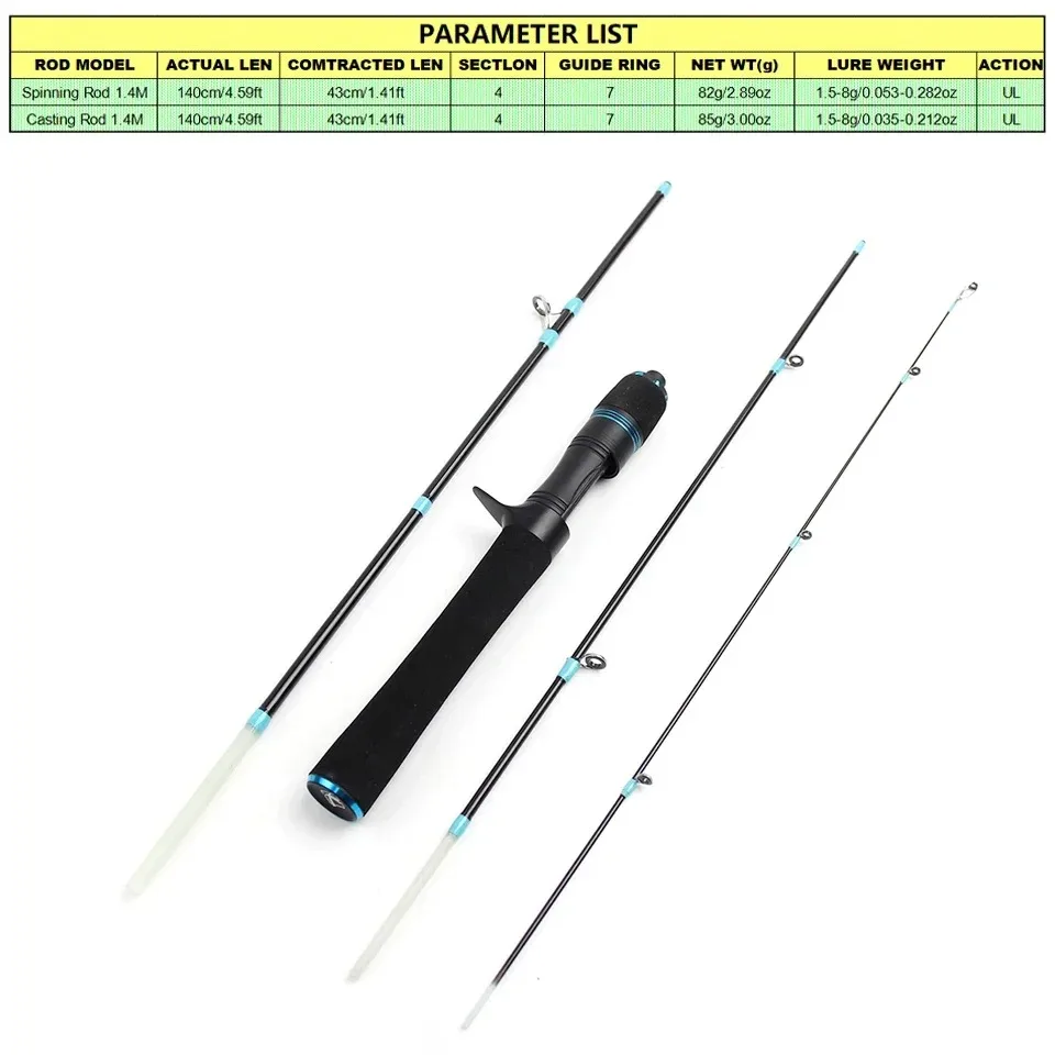 Esta caña de pescar portátil de 1,4 M está diseñada para brindar versatilidad y conveniencia.Perfecto para arroyos, lagos, granjas artificiales y recreación al aire libre, combina un diseño compacto de cuatro secciones (cada 43 cm) con fácil montaje, lo que lo convierte en un compañero de viaje ideal.Fabricada con fibra de carbono de alta calidad con un elegante acabado negro, la caña es liviana pero duradera, lo que garantiza un rendimiento confiable para los entusiastas de la pesca, principiantes y actividades familiares.