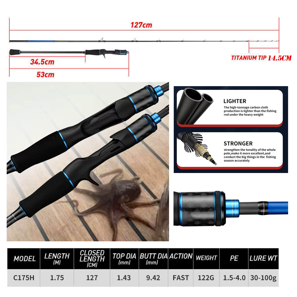 Caña de pescar de 1,75 m para pulpo, potente caña de jigging con punta de titanio y caña de pescar de acción 9:1 en barco de alta calidad