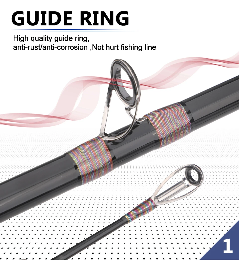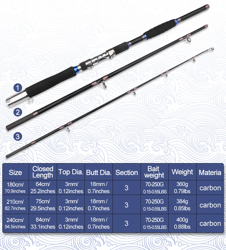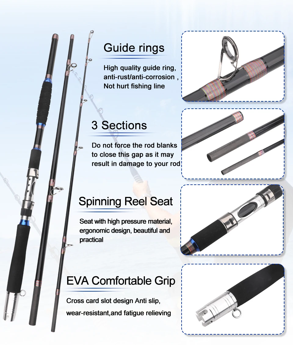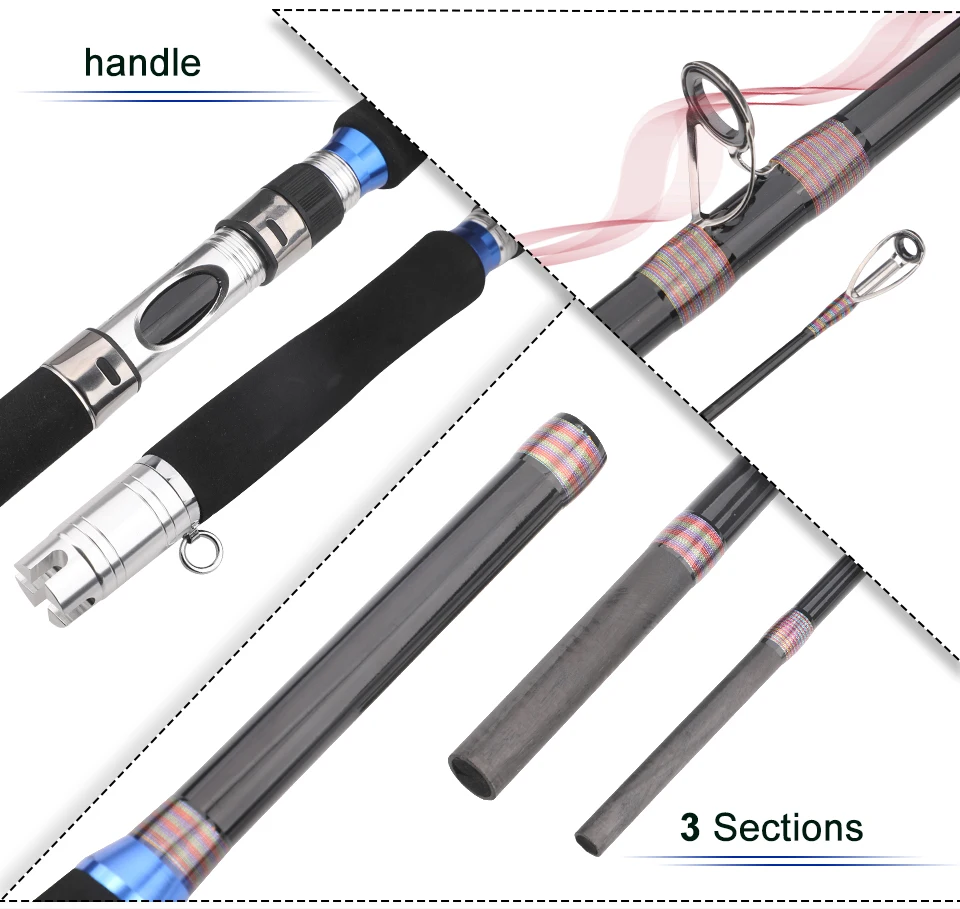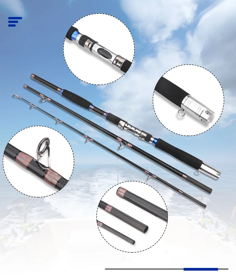 Caña de pescar de 3 secciones, gotero profundo de agua salada, caña de juego grande, caña de rodillo para barco convencional, caña de pescar de carbono