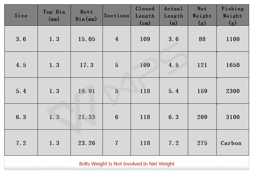 Longitud: 3,6-7,2 m Longitud cerrada: 109-118 cm