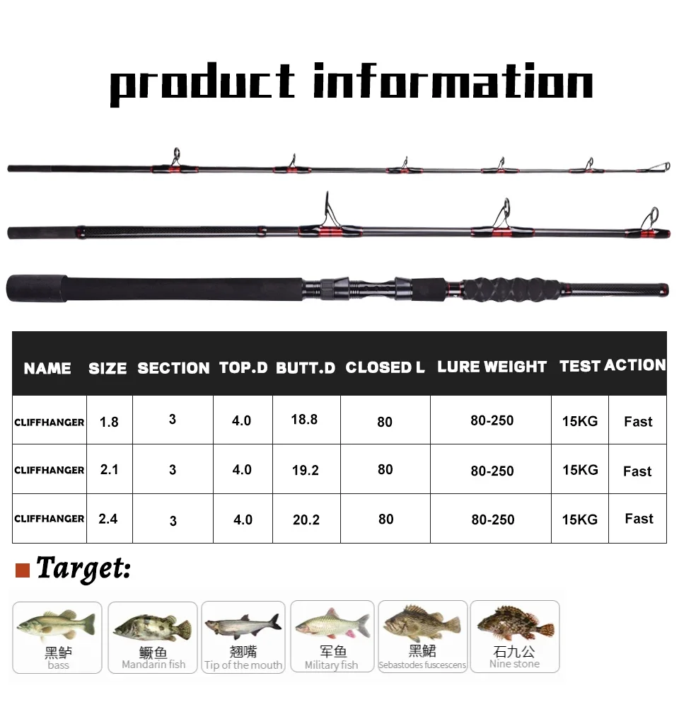 TAMAÑO: 1,8|DIÁMETRO SUPERIOR: 4.0|Peso: 358 g|MODELO: Spinning|DIÁMETRO DE BOTOS: 18,8 mm|L CERRADO: 65cm|PESO DE LA CERRADURA: 80-250|PRUEBA: 15KG|SECCIÓN: 3|