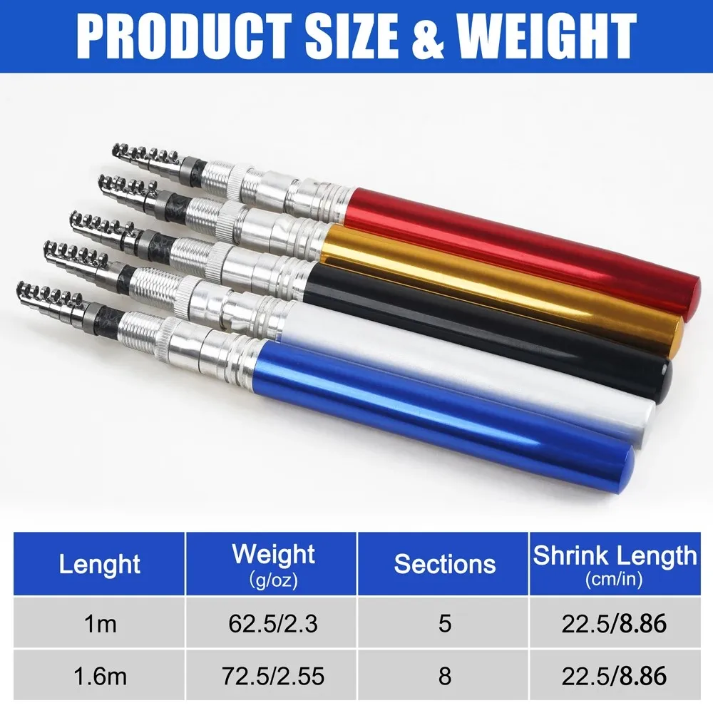TELESCÓPICO Y CONVENIENTE: la caña de pescar portátil adopta un diseño retráctil sensible, 1M: 5 secciones, longitud plegada: 8,86 pulgadas, longitud desplegada: 39,37 pulgadas. 1,6 M: 8 secciones, longitud plegada: 8,86 pulgadas, longitud desplegada: 62,99 pulgadas, tamaño de bolsillo fácil de manejar