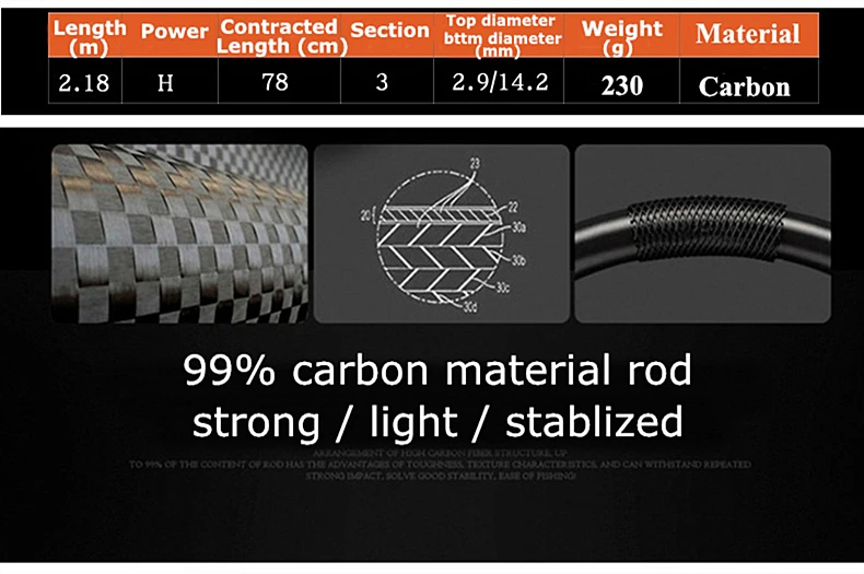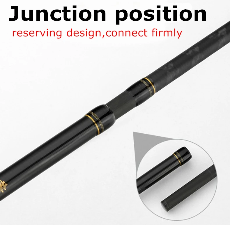 Mano de obra delicada, fibra de carbono de calidad, 3 secciones portátiles, potencia H, sensación manual muy dura. Solo varilla de fundición.
