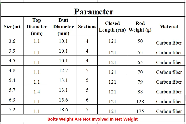 Longitud: 3,6-7,2 m Longitud cerrada: 121cm