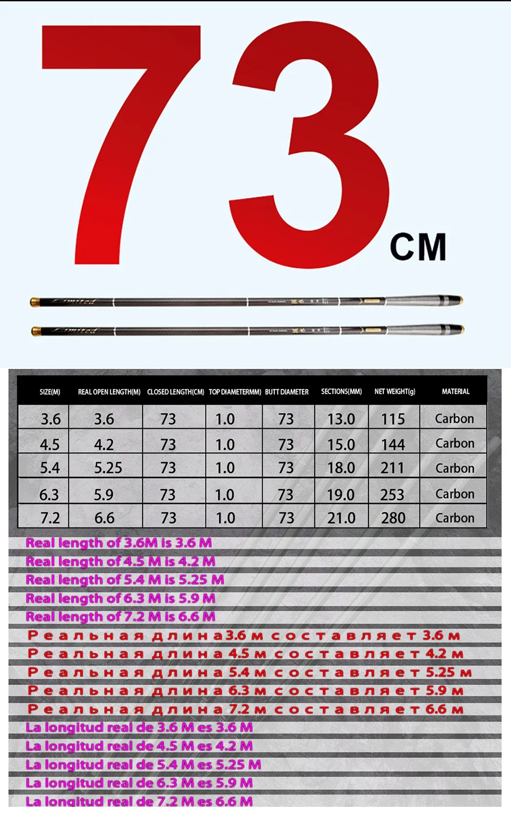Caña de pescar de carbono súper ligera para carpa, 3,6/4,5/5,4/6,3/7,2 M, caña de pescar telescópica portátil, longitud cerrada, herramienta de pesca de 73cm