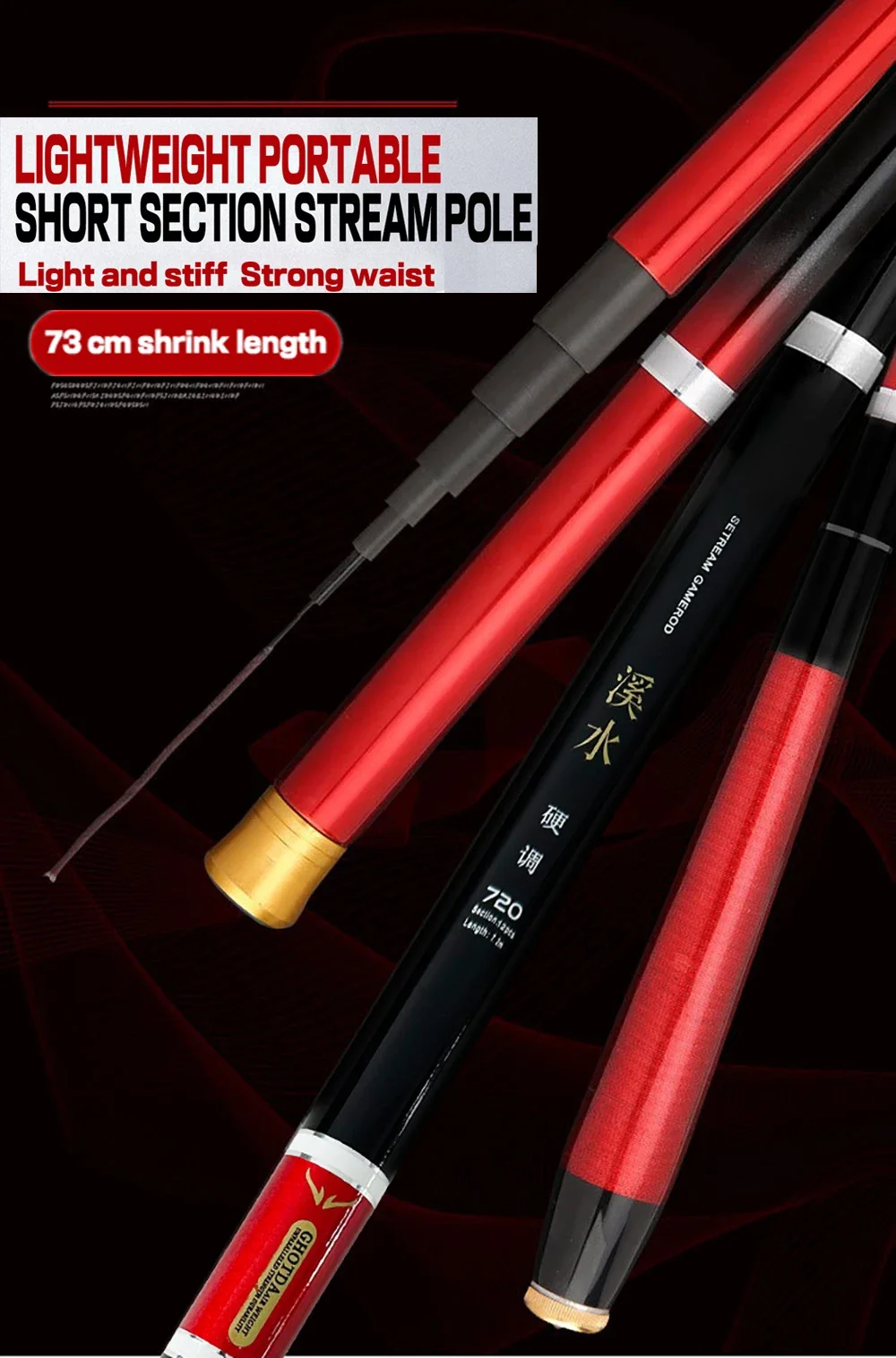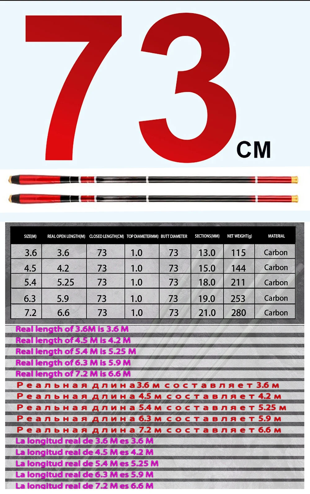 Longitud real de 7,2 M es 6,6 MPor favor, preste atención a la longitud real.(Peso neto de pesca: el peso de los objetos se sostiene directamente, no el peso al pescar)�� Características�1. Tapa de hebilla de metal, proceso de pintura en aerosol y mano de obra exquisita resaltan la alta calidad del poste.