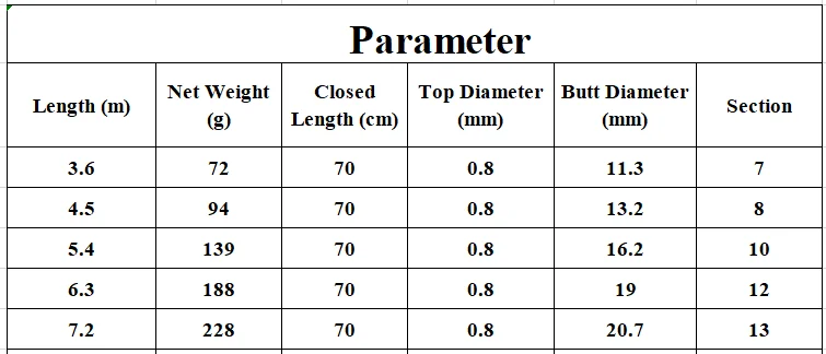 Sección de la varilla: 7/8/10/12/13 Peso: 72-228g