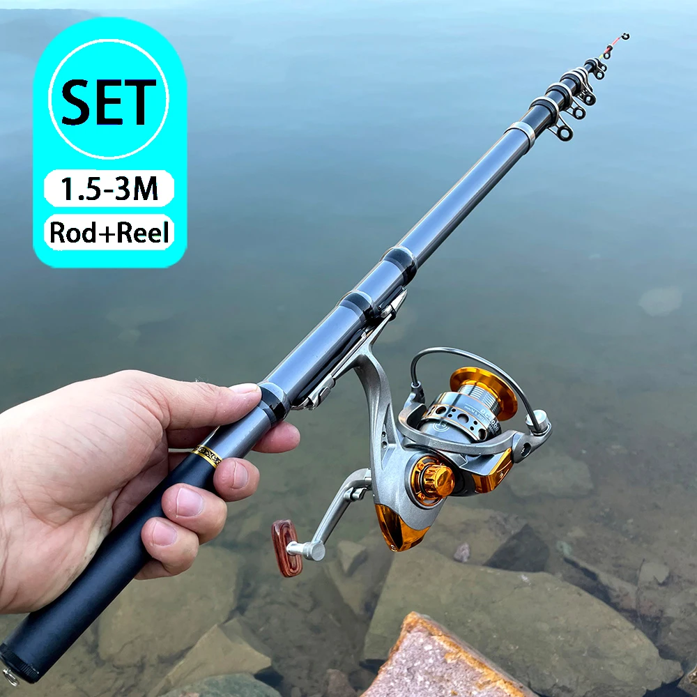 Caña de pescar en roca de 1,5 m-3,0 m, carrete combinado de fibra de carbono telescópica y carretes giratorios de relación de transmisión 5,2: 1 para Pesca de lubina