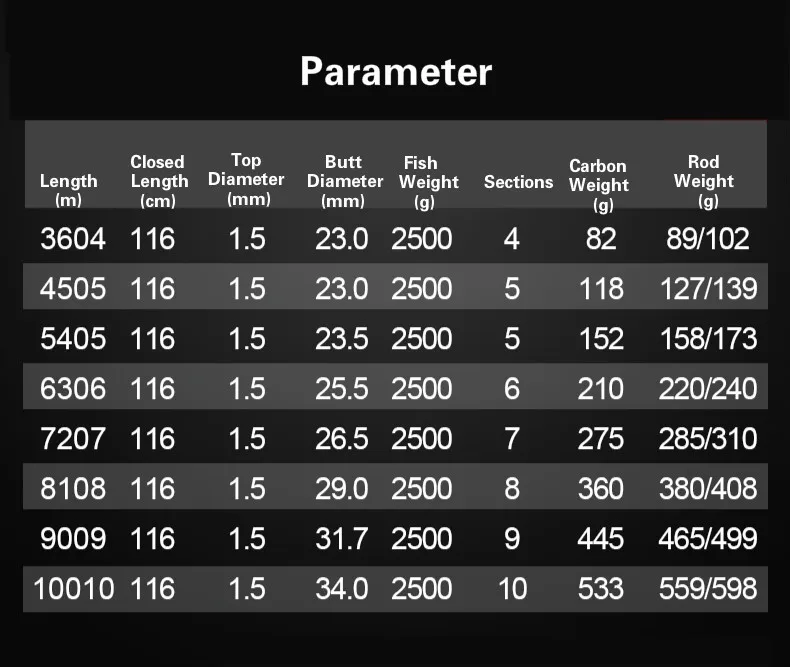 Longitud: 3,6-10 m Longitud cerrada: 116cm