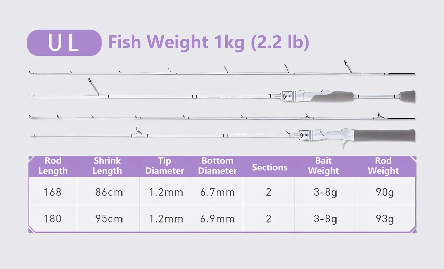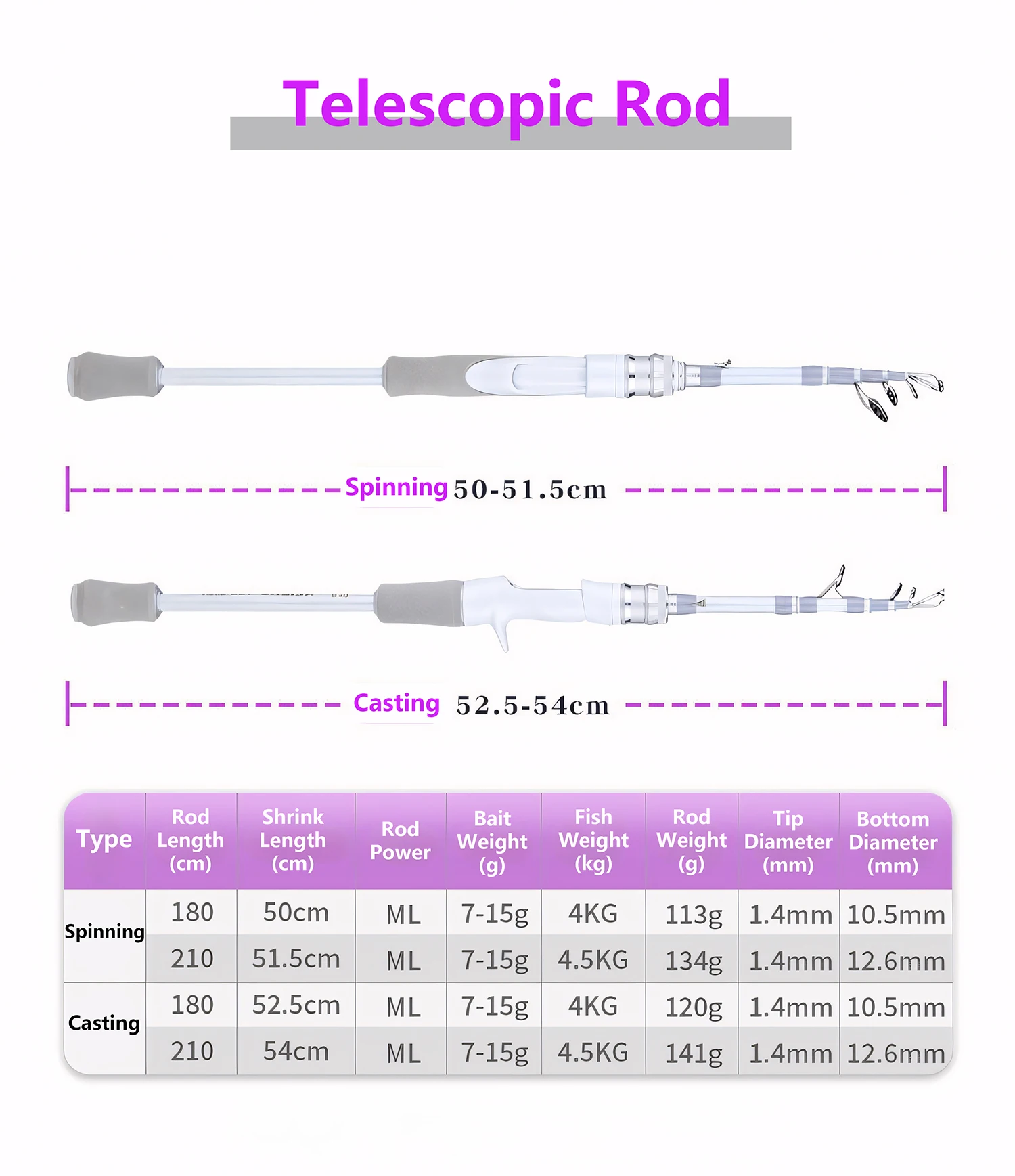 * Longitud de la varilla de fundición 1,8 m / Longitud retráctil 52,5 cm / Peso de la varilla 120 g (0,264 lb) / Peso del cebo 7-15 g (0,53 oz) / Diámetro de la punta 1,4 mm / Diámetro inferior 10,5 mm