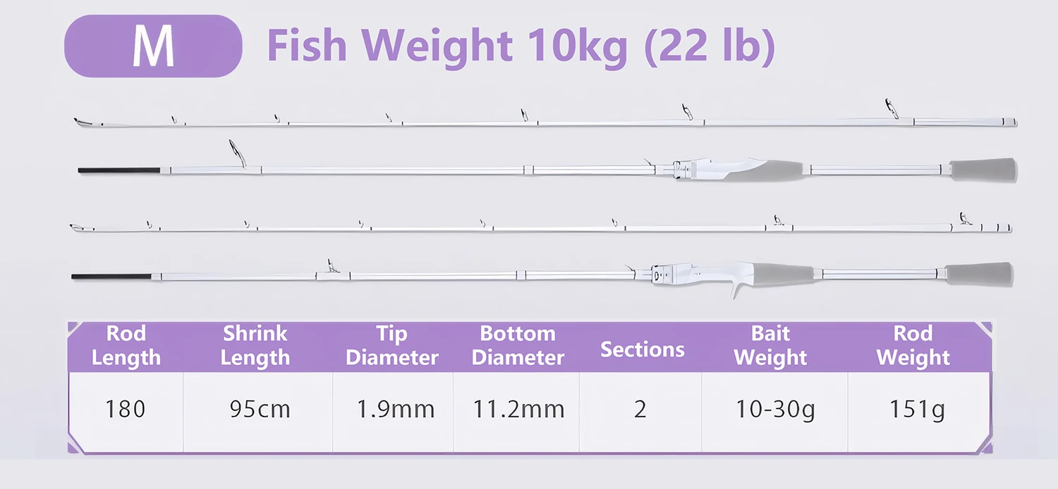 * Longitud de la varilla 1,8 m / Longitud retráctil 95 cm / Peso de la varilla 151 g (0,332 lb) / Peso del cebo 10-30 g (1 oz) / Diámetro de la punta 1,9 mm / Diámetro inferior 11,2 mm / 2 secciones