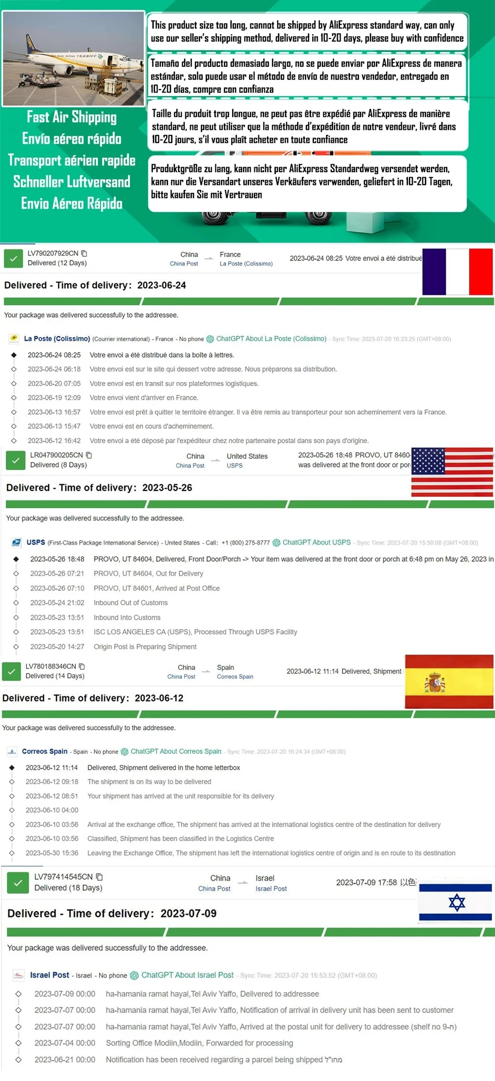 * Cuando no reciba el paquete, no abra una disputa, contáctenos primero, el paquete puede ser enviado al punto de recogida por El personal postal, también existe la posibilidad de pérdida, si se confirma la pérdida, no se preocupe, contáctenos, volveremos a emitir un nuevo producto a Usted