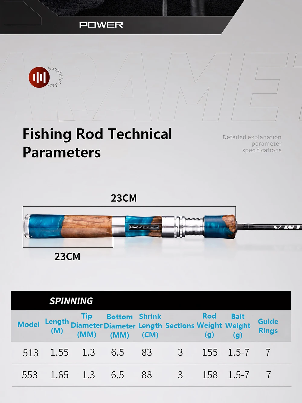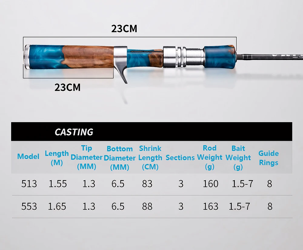 * Longitud de la varilla 1,55 M/Longitud de contracción 83cm/Peso de la varilla 160g (0.352 lb) /Peso del cebo 1,55G-7g (0.054 oz - 0.246 oz) /Diámetro de la punta 1,3mm/Diámetro inferior 6,5mm / 8 anillos guía FUJI