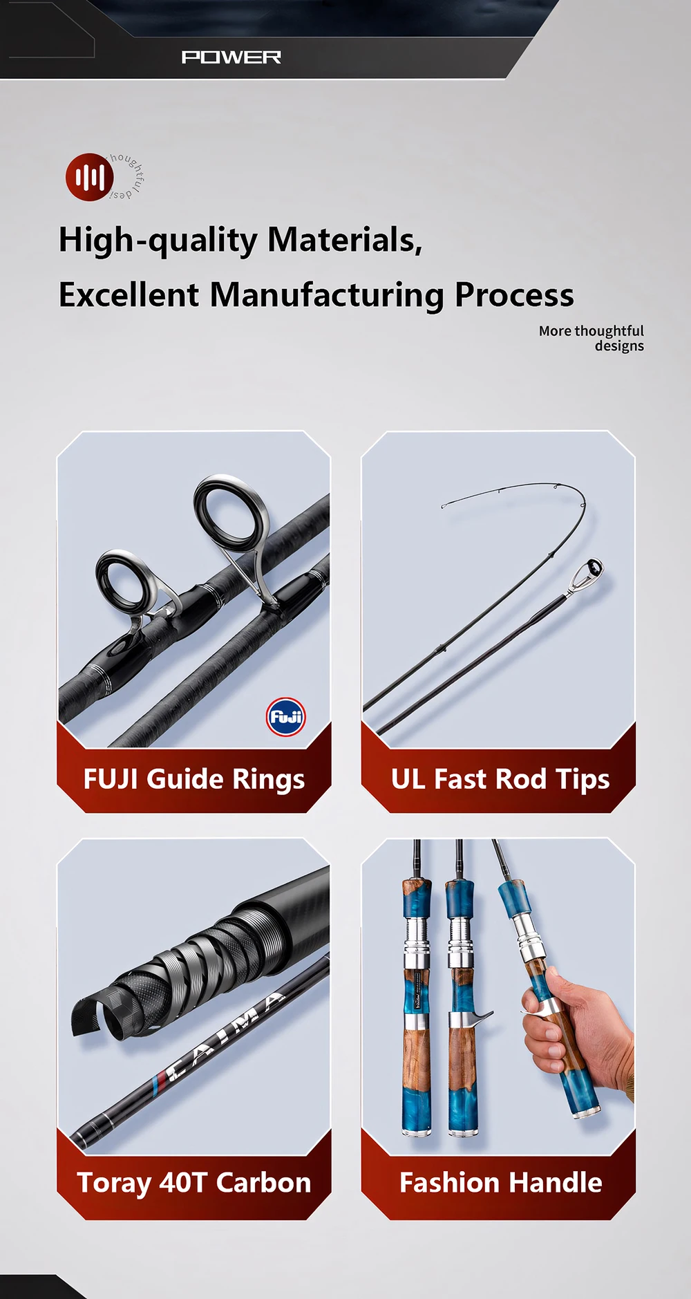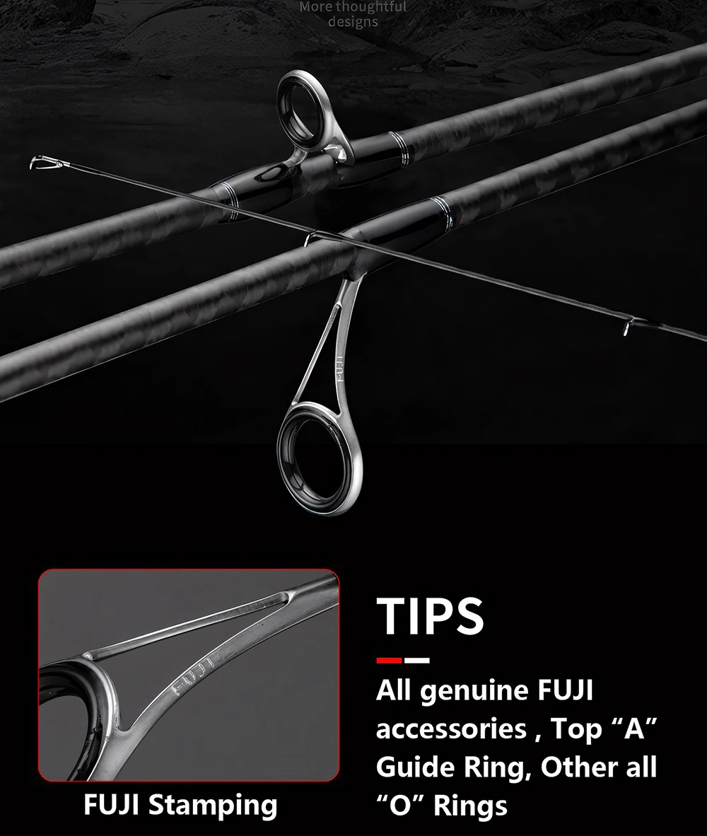 * Longitud de la varilla 1,55 M/Longitud de contracción 83cm/Peso de la varilla 155g (0.341 lb) /Peso del cebo 1,55G-7g (0.054 oz - 0.246 oz) /Diámetro de la punta 1,3mm/Diámetro inferior 6,5mm / 7 anillos guía FUJI