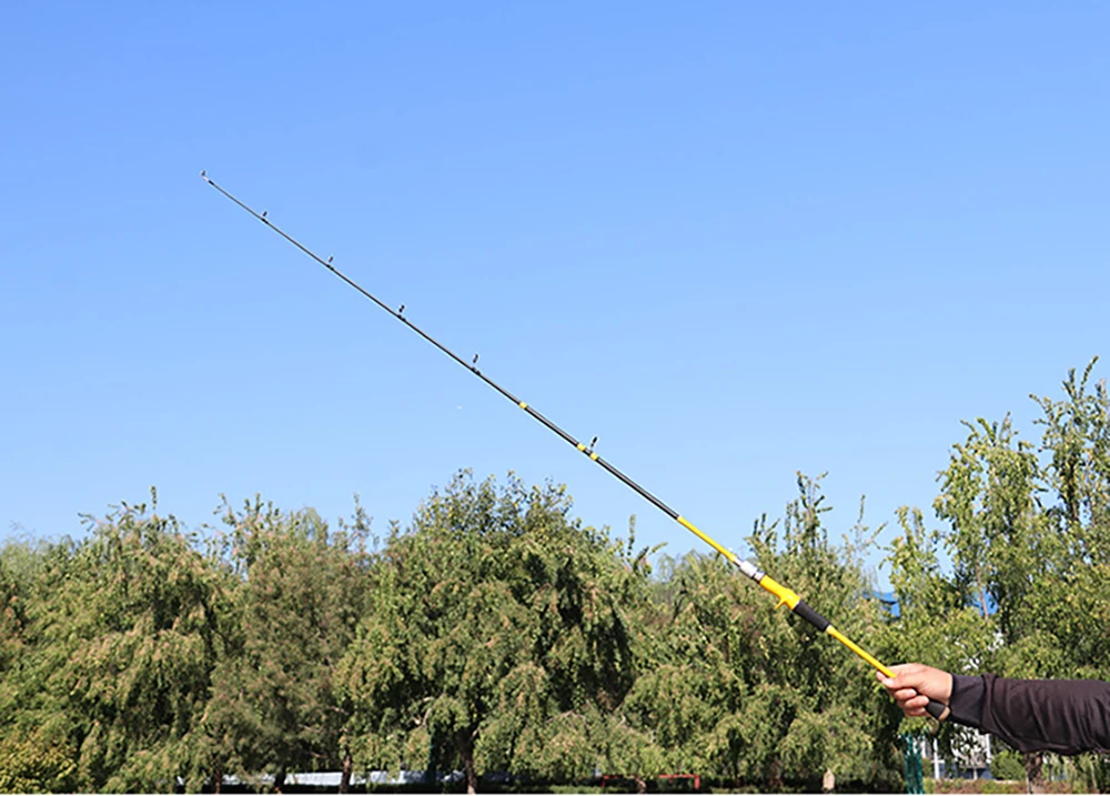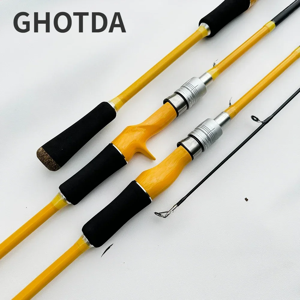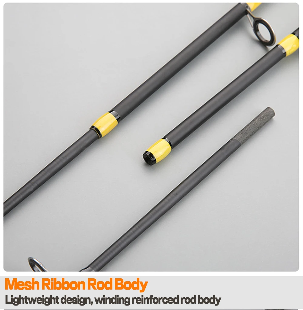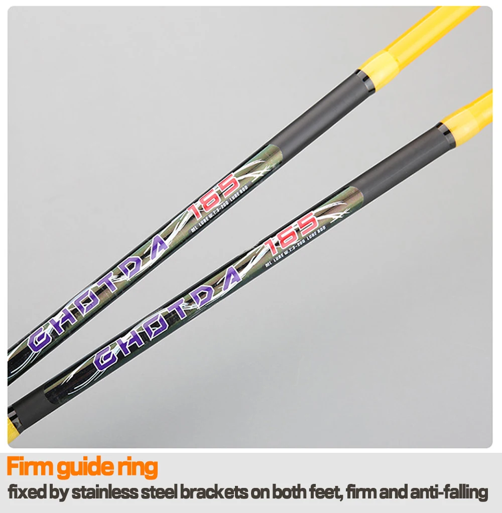 PARÁMETROLongitud del modelo: 1,65 M/1,80 MLongitud cerrada: 87cm/ 94cmSecciones: 2Potencia: MLMaterial: fibra de carbonoPeso del cebo: 3G-20gMango: fundición (con gancho)/hilado (sin gancho)Color: AmarilloCaracterísticasPunta de varilla gruesaLa tonalidad es sensible, atrapa peces rápidamente, no es fácil de romper.