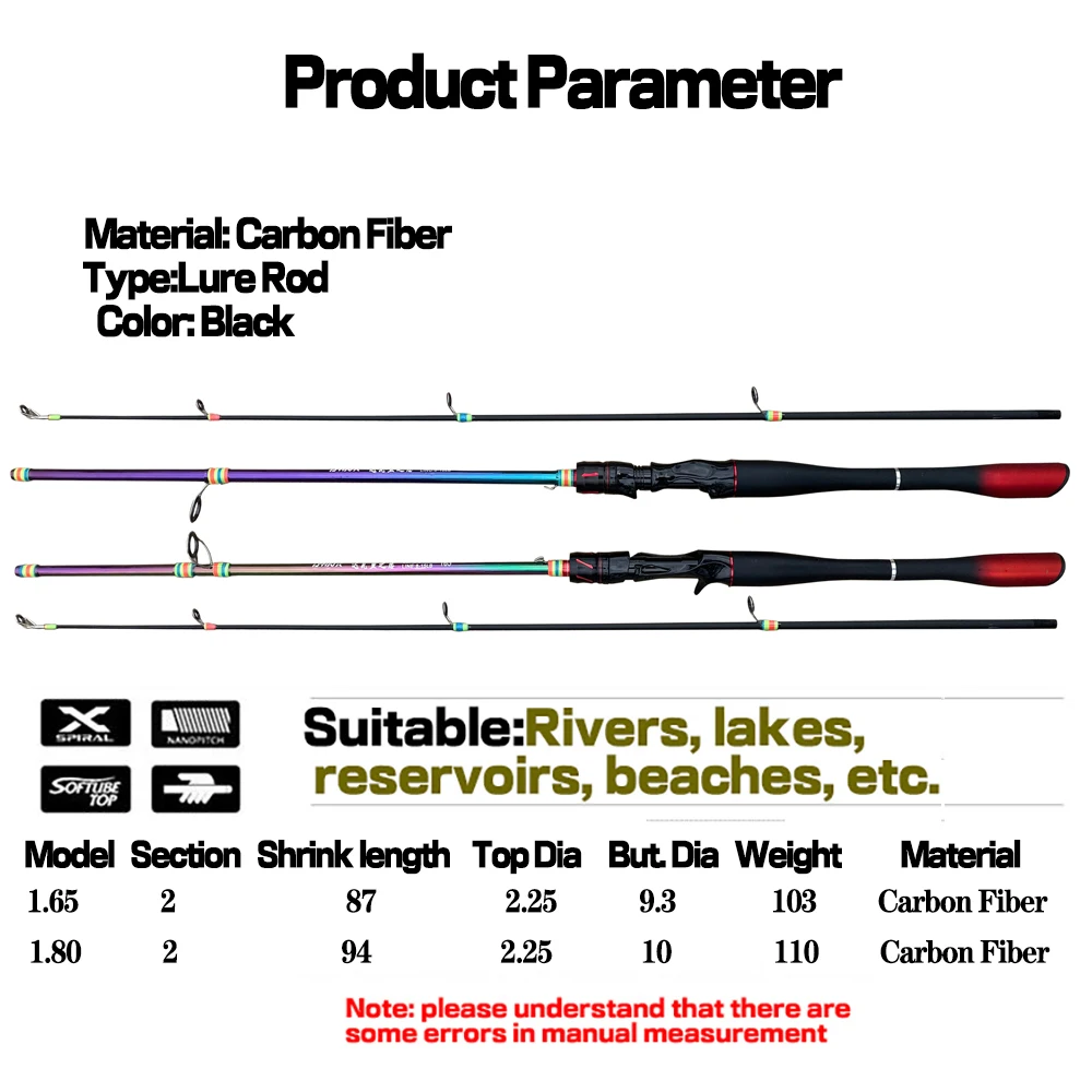 Caña de pescar giratoria de 1,8 m y 1,65 M, fibra de carbono ultraligera, 2 secciones, caña de pescar Baitcasting para trucha lubinaEsta caña de pescar ultraligera de fundición giratoria es la herramienta perfecta para cualquier pescador que quiera experimentar la emoción de atrapar peces grandes. Hecha de fibra de carbono de alta calidad y tela de carbono multicapa, la caña está diseñada para ser ligera y resistente, lo que la hace perfecta para largos días de pesca. El diseño del señuelo de Punta sólida garantiza que la caña sea lo suficientemente sensible como para detectar incluso la más mínima mordida, mientras que la acción M equilibrada permite un lanzamiento suave y preciso.